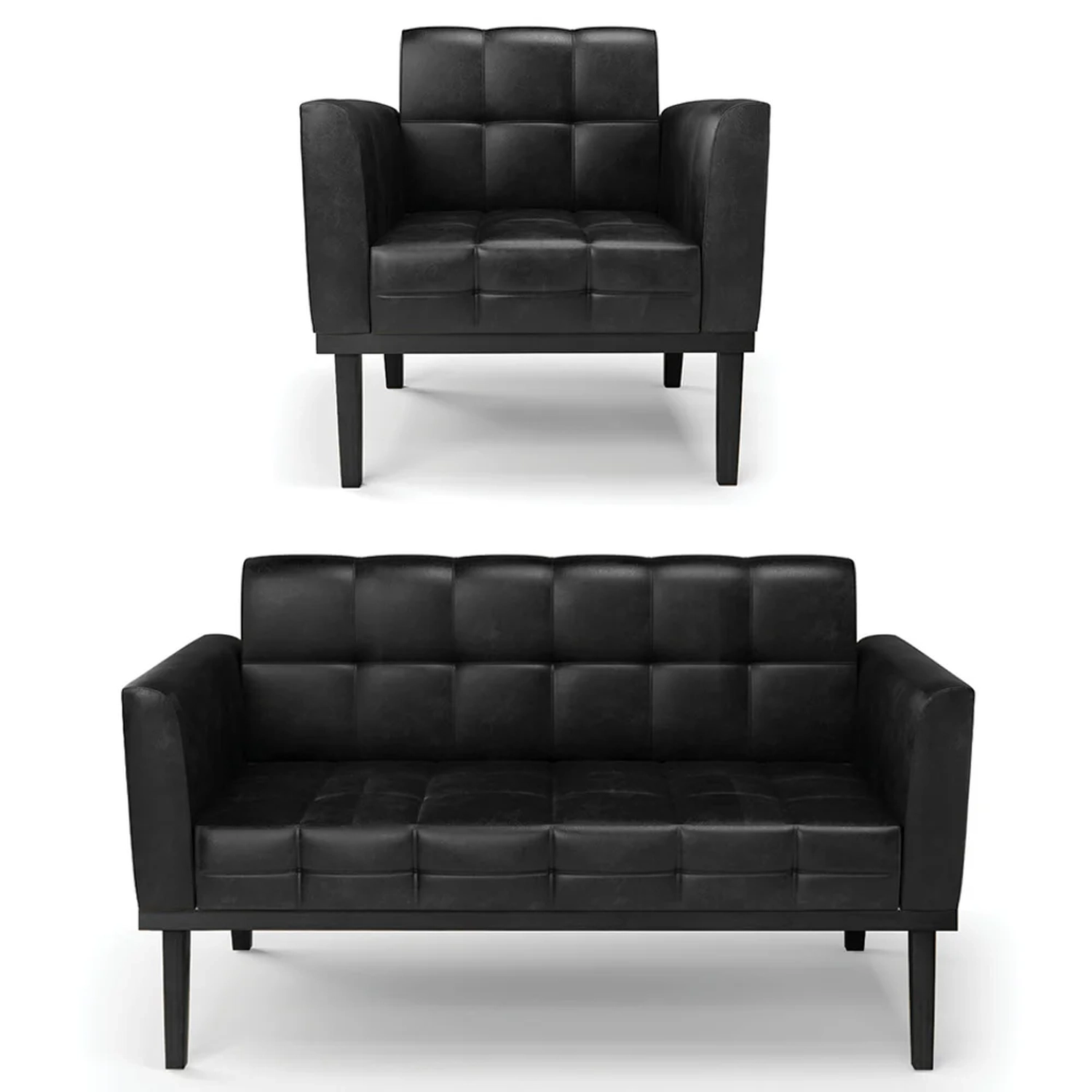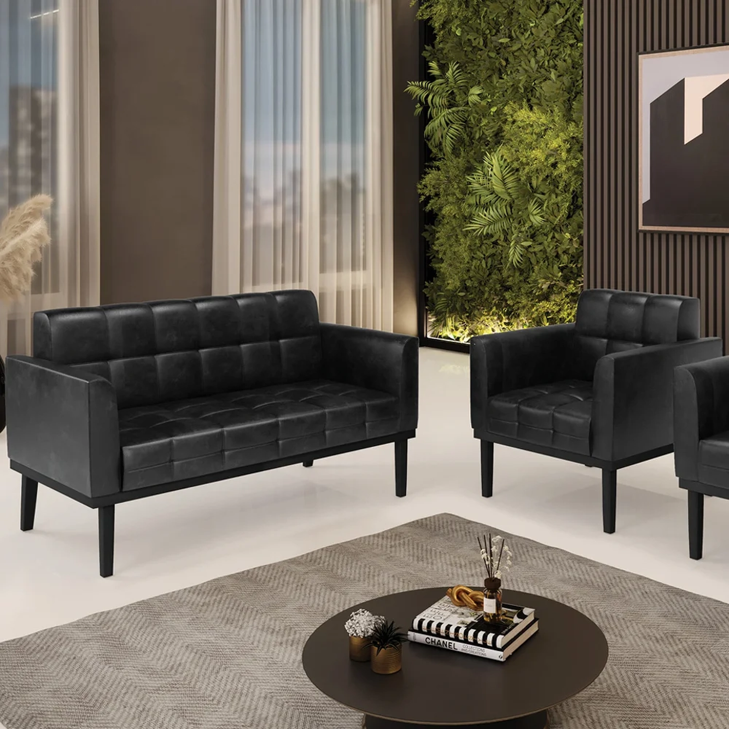 O Sofá Namoradeira e 1 Poltrona Base Madeira Preto Ana Sintético PU Preto, da Ibiza é o conjunto ideal para quem busca beleza, conforto e versatilidade. Você pode usar na sua Sala De Estar, recepção ou qualquer outro ambiente que desejar.