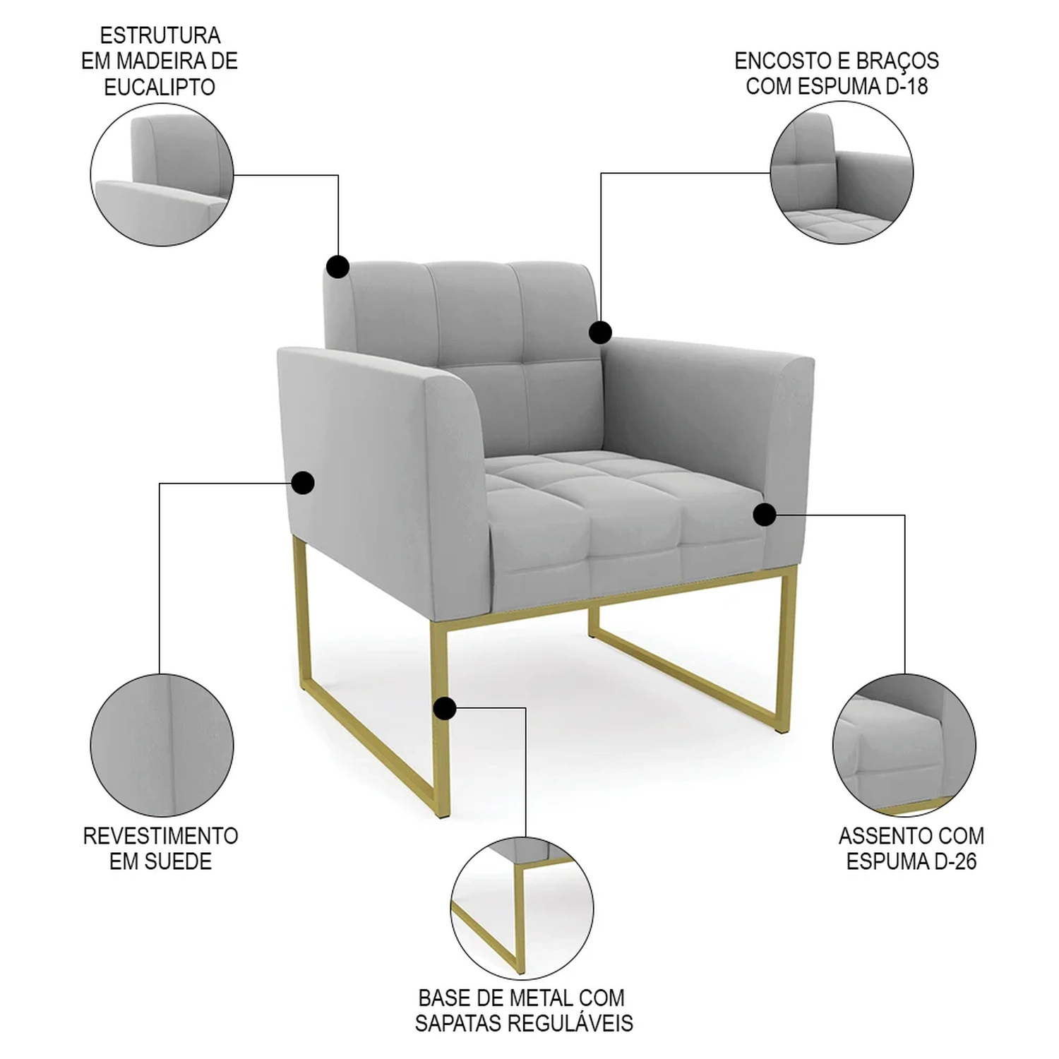 Material da Espuma: Assento D-26/ Encosto e braços D-18.