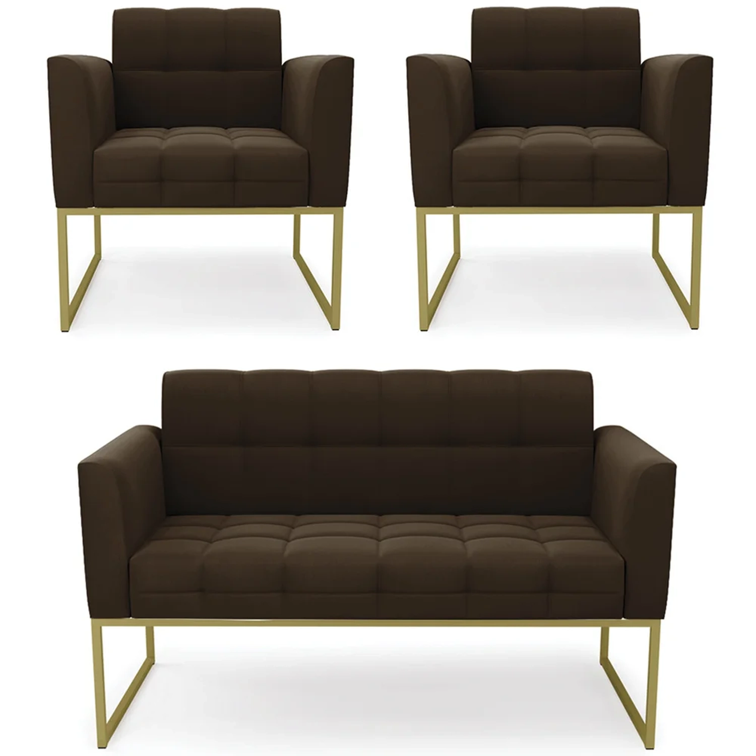O Sofá Namoradeira e 2 Poltronas Base Industrial Dourado Ana Suede Marrom, da Ibiza é o conjunto ideal para quem busca beleza, conforto e versatilidade. Você pode usar na sua Sala De Estar, recepção ou qualquer outro ambiente que desejar.