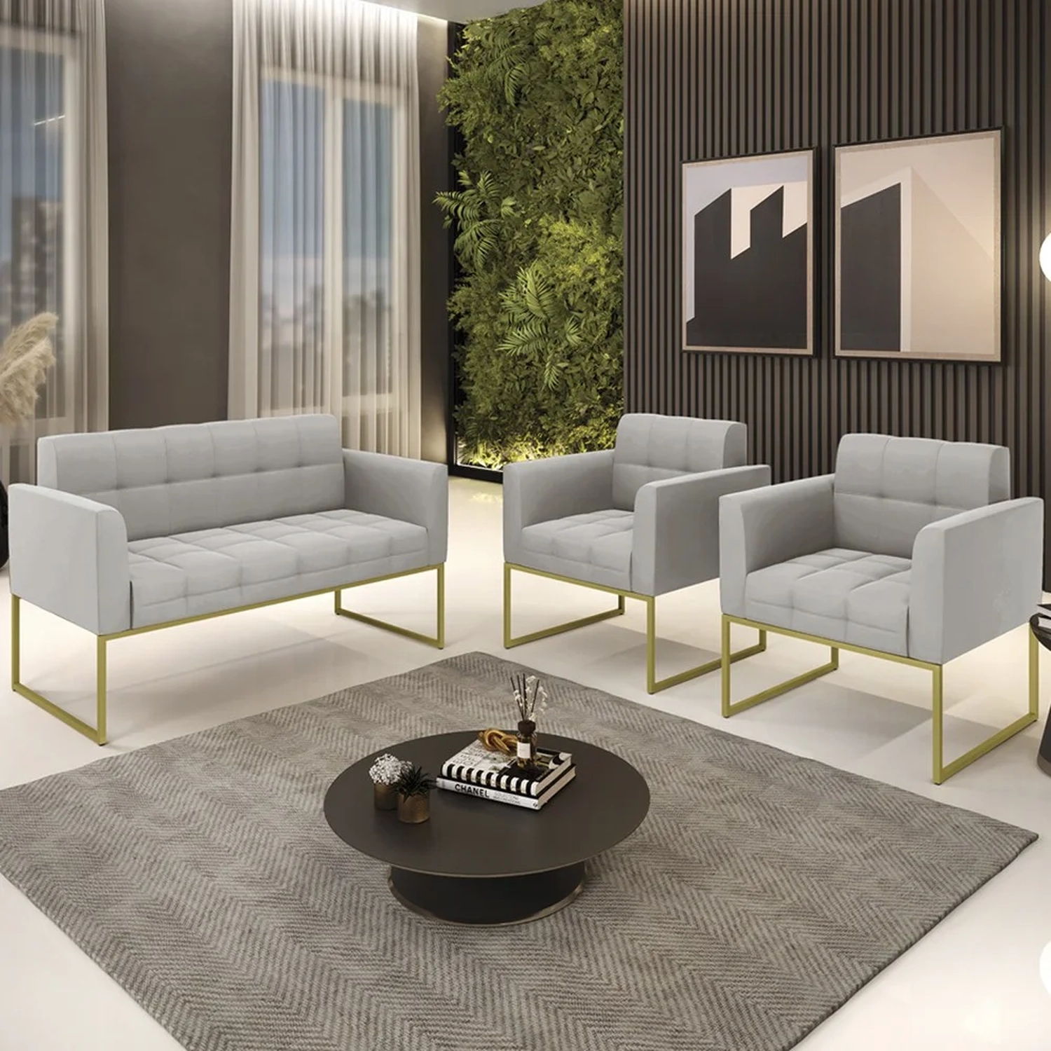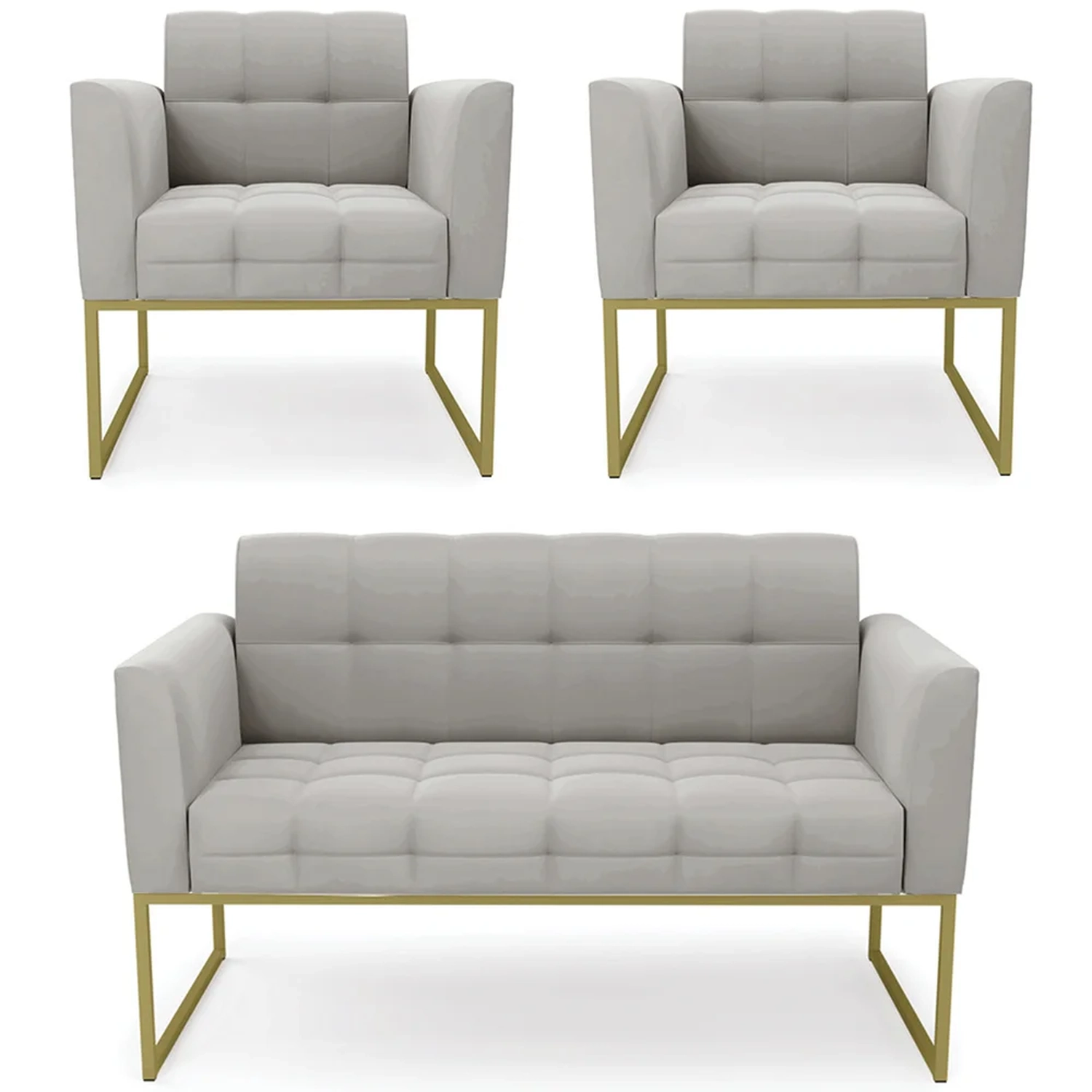O Sofá Namoradeira e 2 Poltronas Base Industrial Dourado Ana Veludo Cinza, da Ibiza é o conjunto ideal para quem busca beleza, conforto e versatilidade. Você pode usar na sua Sala De Estar, recepção ou qualquer outro ambiente que desejar.