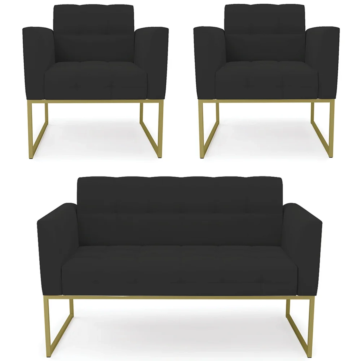 O Sofá Namoradeira e 2 Poltronas Base Industrial Dourado Ana Veludo Preto, da Ibiza é o conjunto ideal para quem busca beleza, conforto e versatilidade. Você pode usar na sua Sala De Estar, recepção ou qualquer outro ambiente que desejar.