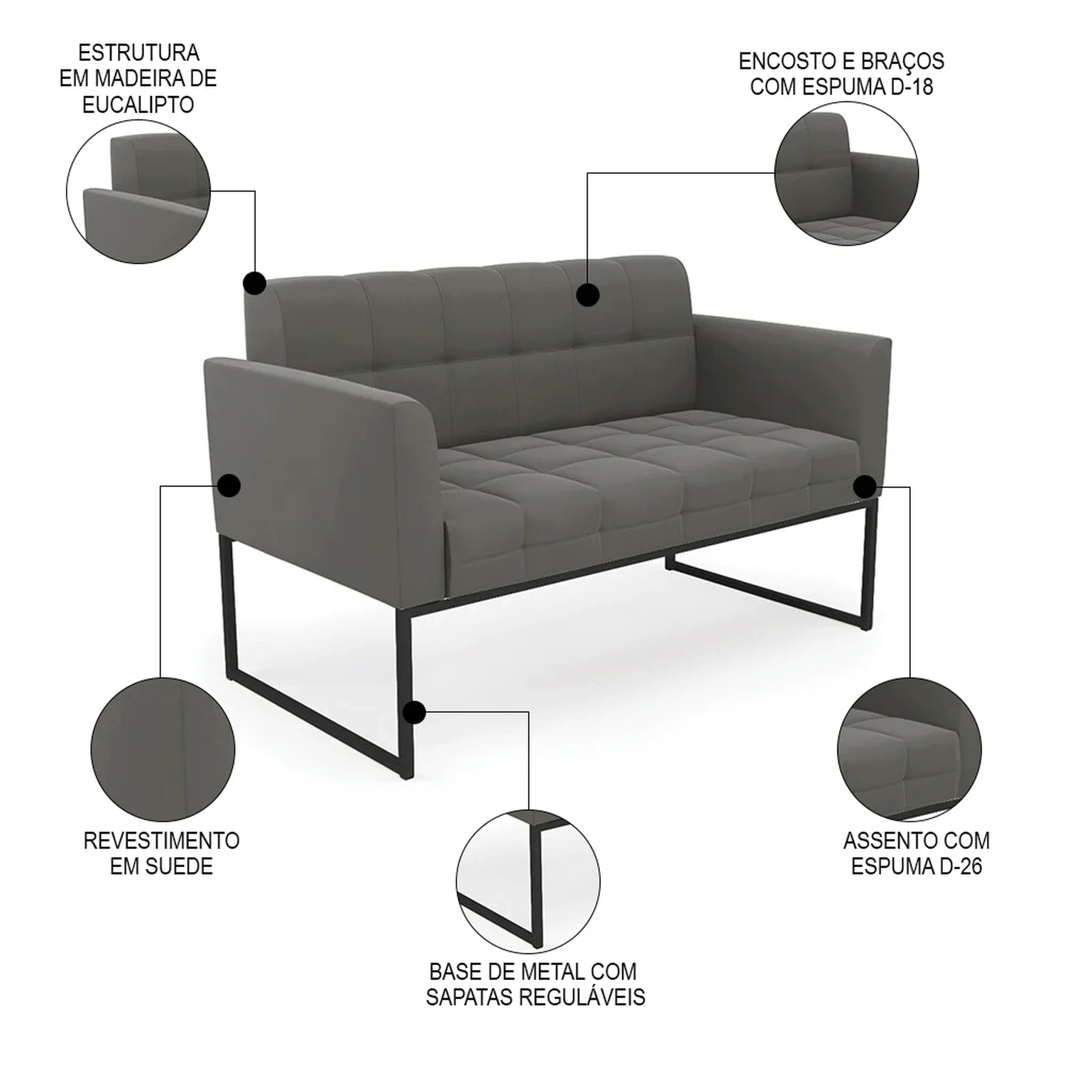 Material da Espuma: Assento D-26/ Encosto e braços D-18.