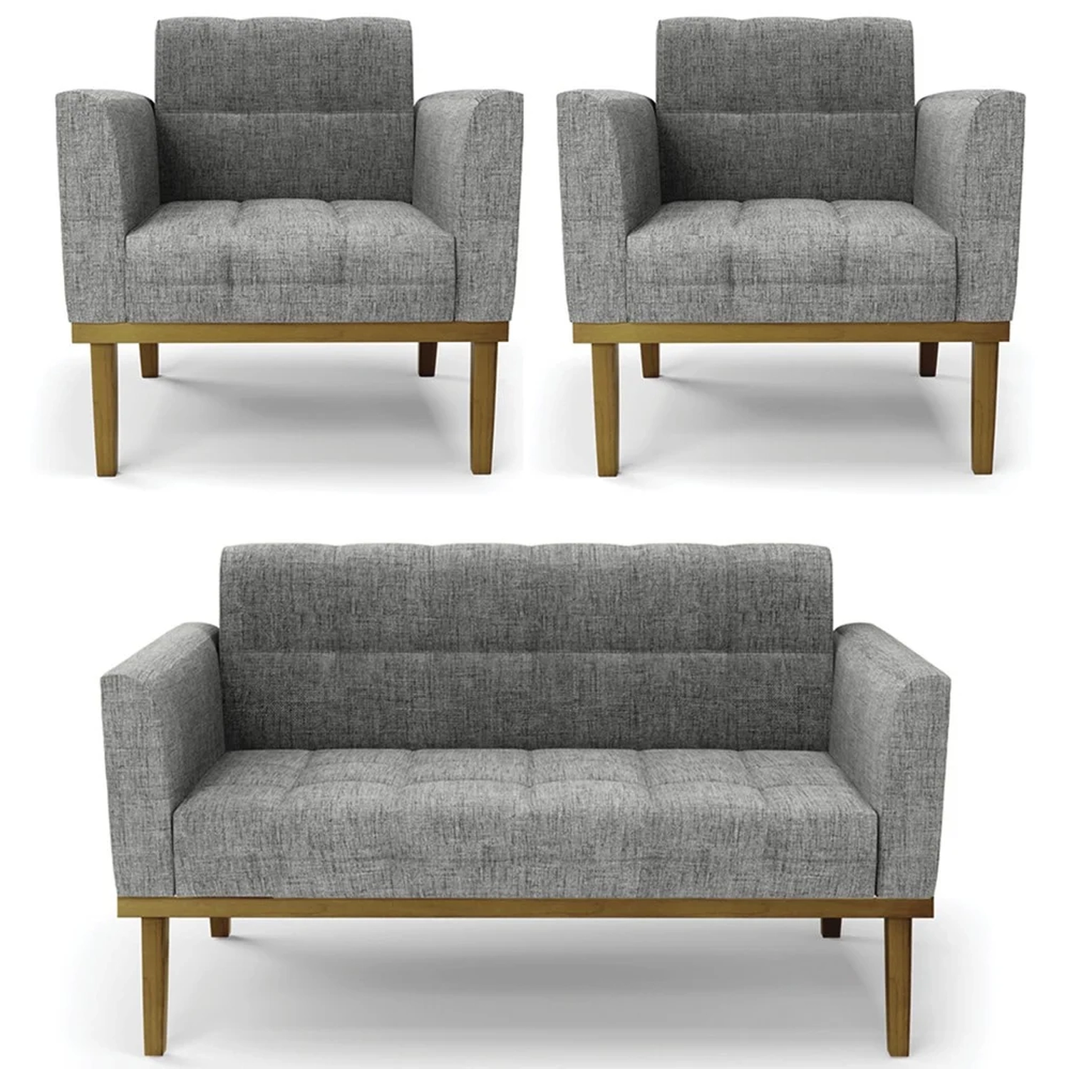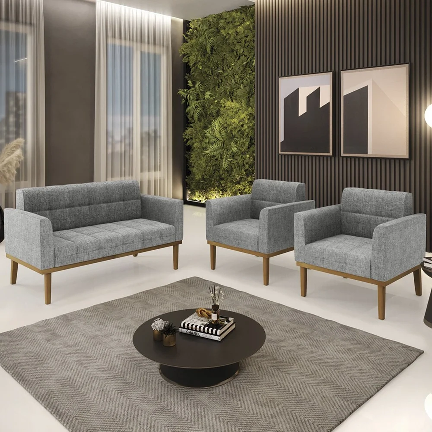 O Sofá Namoradeira e 2 Poltronas Base Madeira Castanho Ana Linho Grafite, da Ibiza é o conjunto ideal para quem busca beleza, conforto e versatilidade. Você pode usar na sua Sala De Estar, recepção ou qualquer outro ambiente que desejar.