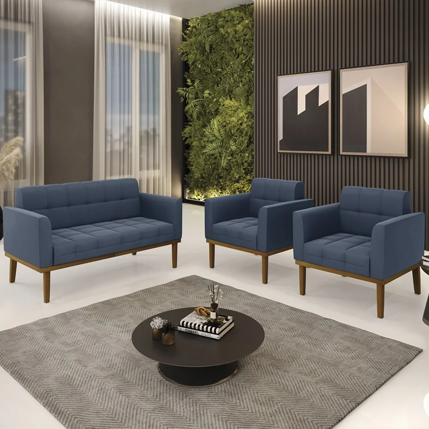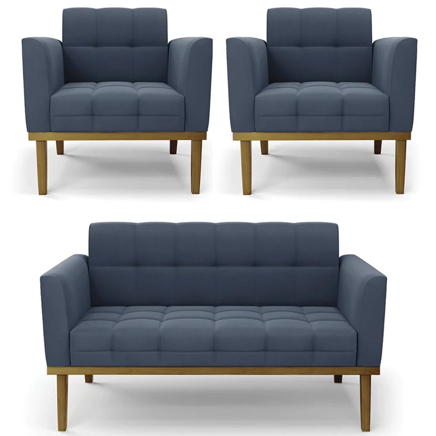 O Sofá Namoradeira e 2 Poltronas Base Madeira Castanho Ana Suede Azul Marinho, da Ibiza é o conjunto ideal para quem busca beleza, conforto e versatilidade. Você pode usar na sua Sala De Estar, recepção ou qualquer outro ambiente que desejar.