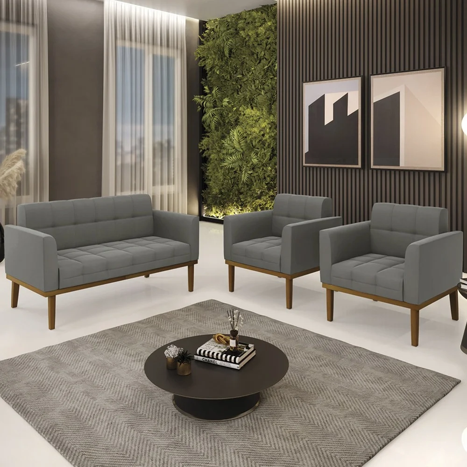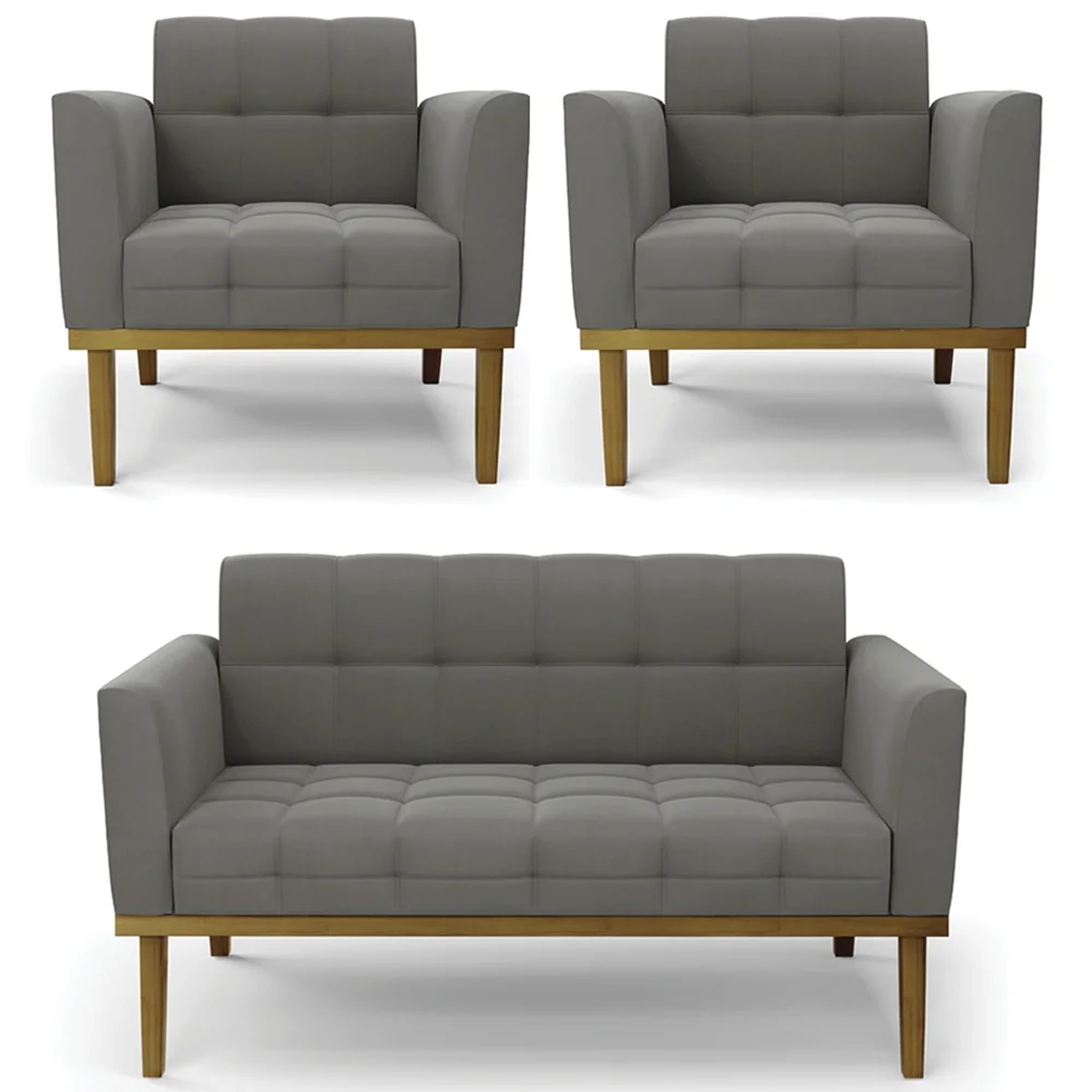 O Sofá Namoradeira e 2 Poltronas Base Madeira Castanho Ana Suede Grafite, da Ibiza é o conjunto ideal para quem busca beleza, conforto e versatilidade. Você pode usar na sua Sala De Estar, recepção ou qualquer outro ambiente que desejar.
