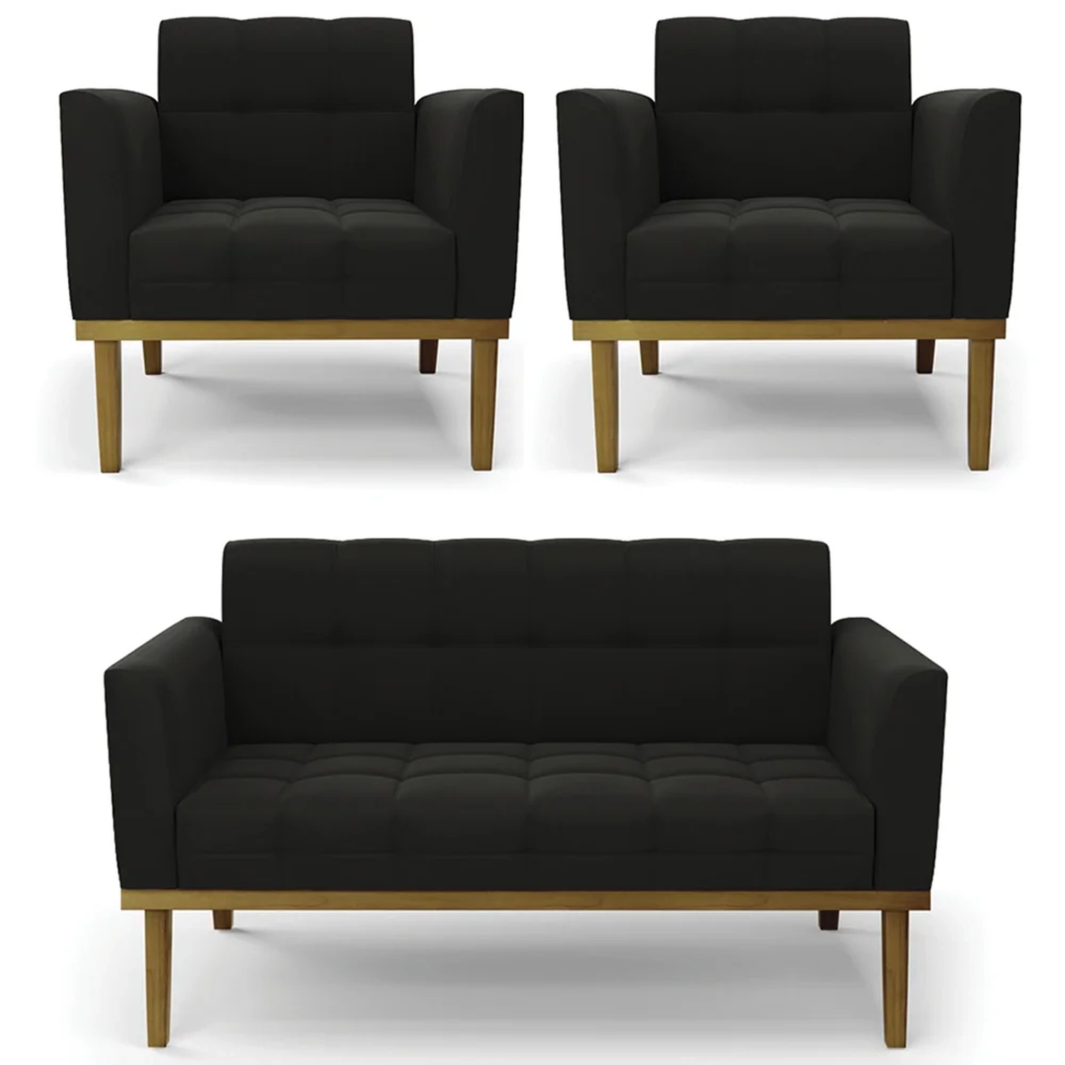 O Sofá Namoradeira e 2 Poltronas Base Madeira Castanho Ana Suede Preto, da Ibiza é o conjunto ideal para quem busca beleza, conforto e versatilidade. Você pode usar na sua Sala De Estar, recepção ou qualquer outro ambiente que desejar.
