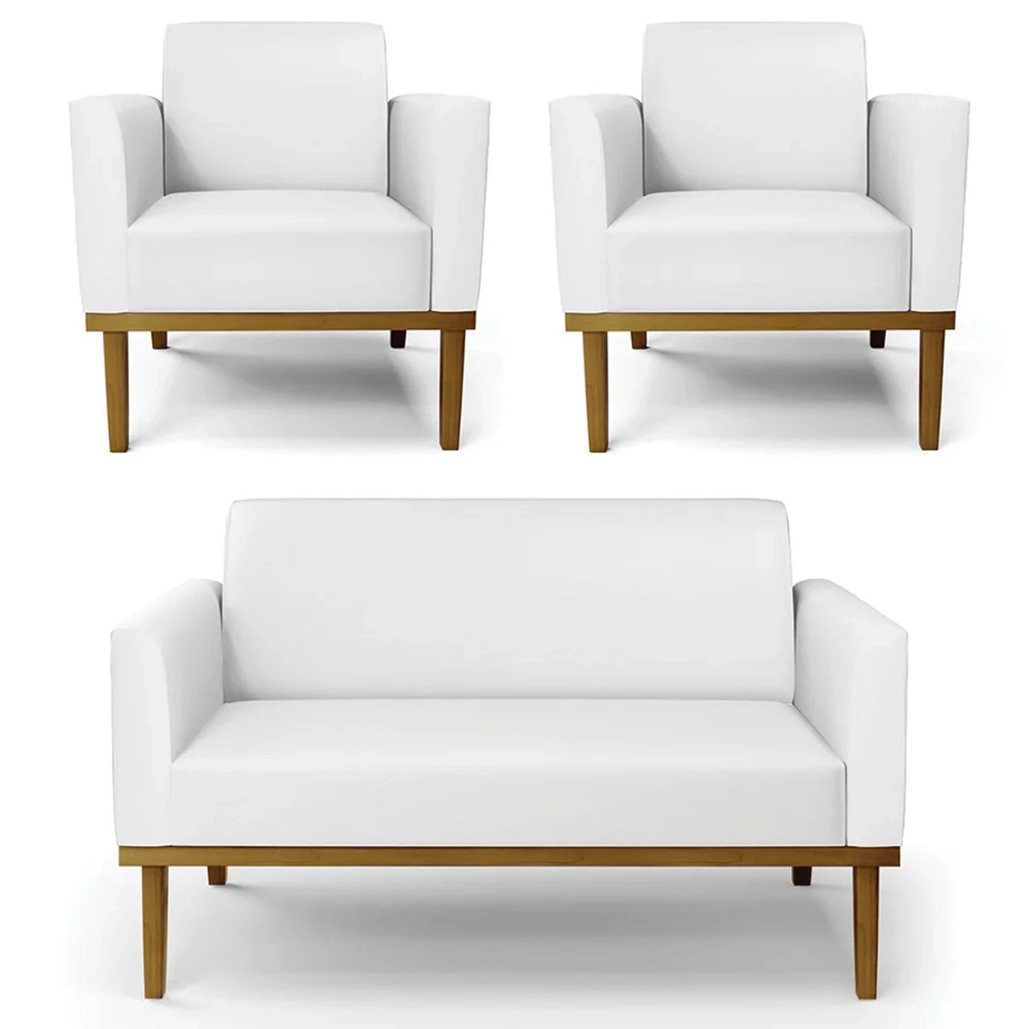 O Sofá Namoradeira e 2 Poltronas Base Madeira Castanho Maressa Sintético Branco, da Ibiza é o conjunto ideal para quem busca beleza, conforto e versatilidade. Você pode usar na sua Sala De Estar, recepção ou qualquer outro ambiente que desejar.