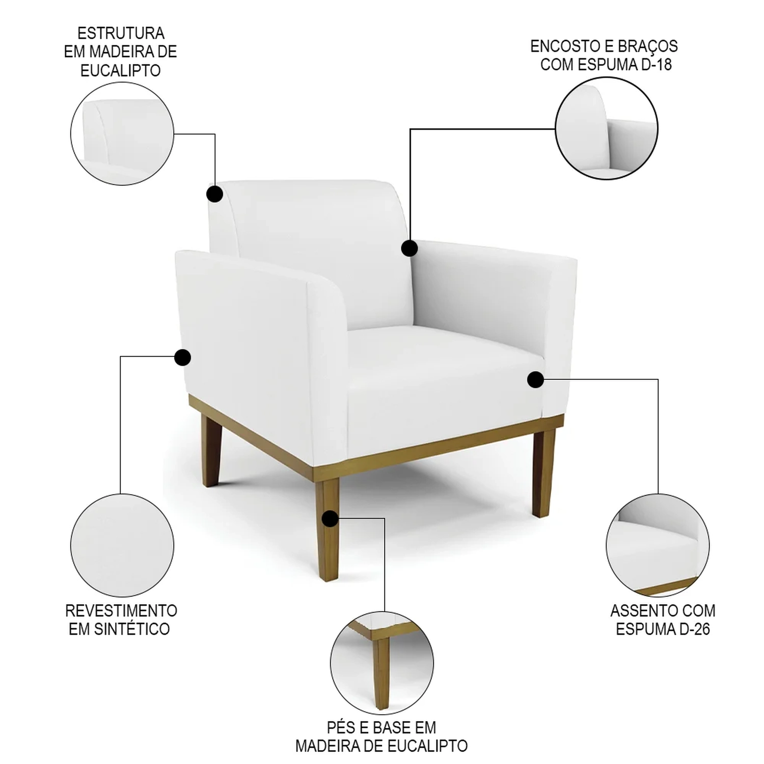 Material da Espuma: Assento D-26/ Encosto e braços D-18.
