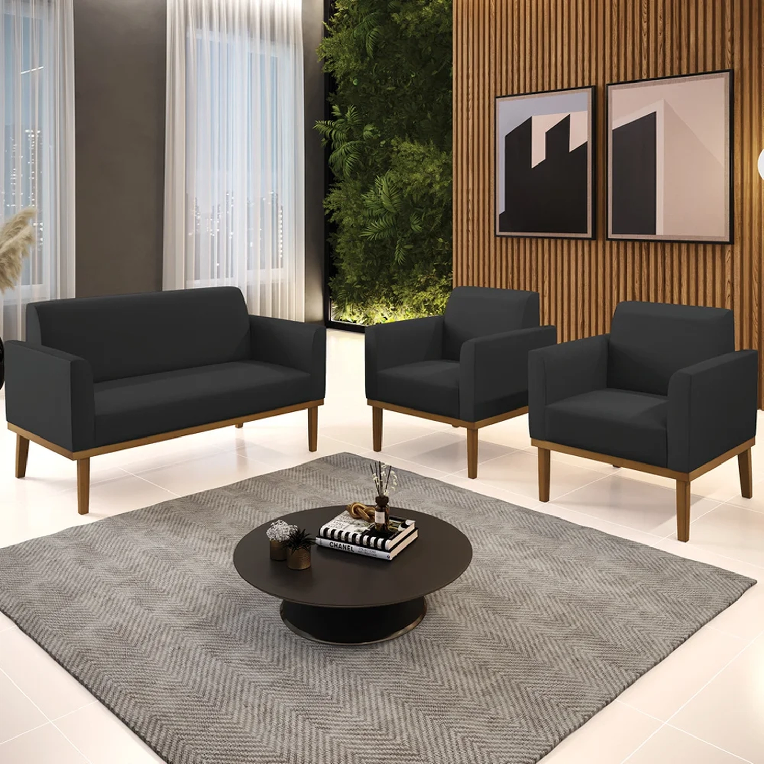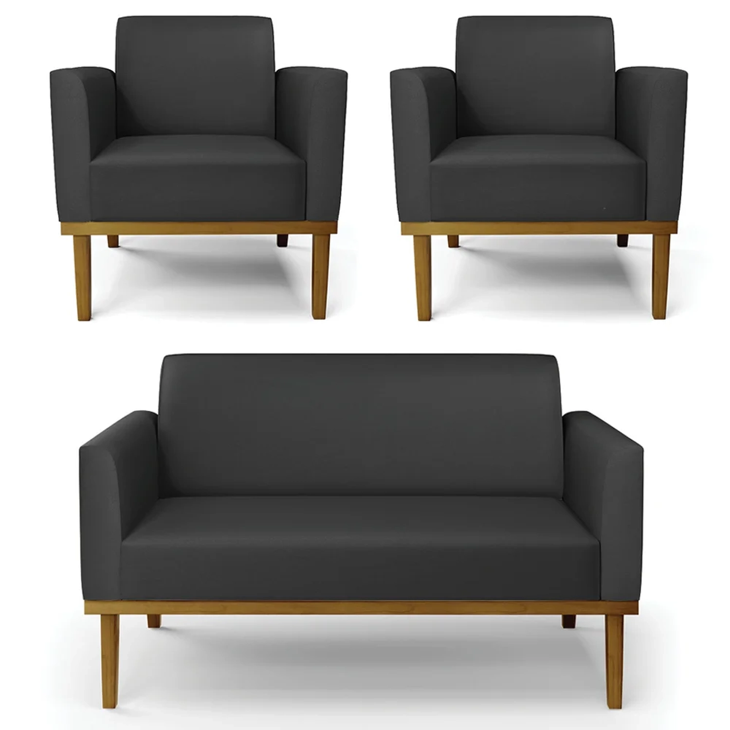 O Sofá Namoradeira e 2 Poltronas Base Madeira Castanho Maressa Sintético Preto, da Ibiza é o conjunto ideal para quem busca beleza, conforto e versatilidade. Você pode usar na sua Sala De Estar, recepção ou qualquer outro ambiente que desejar.