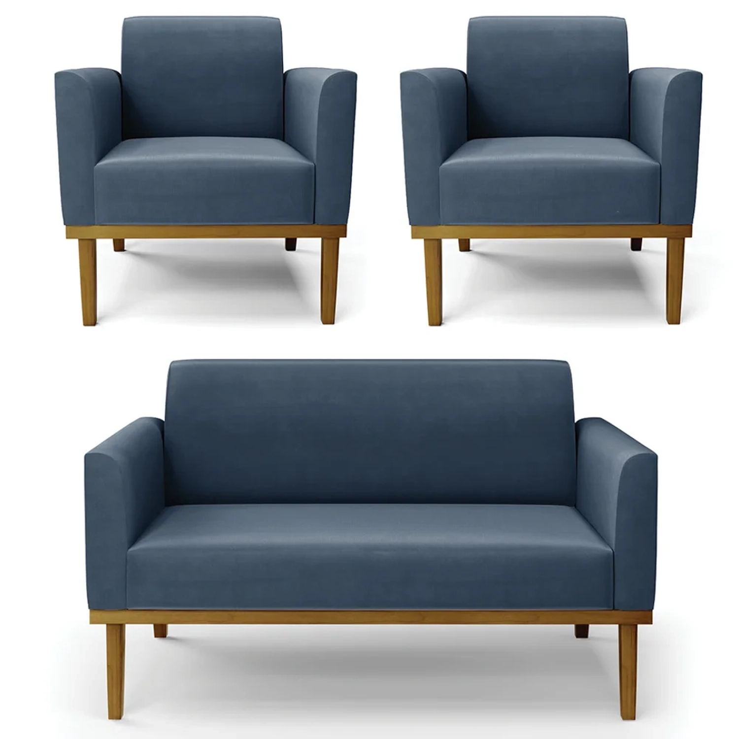 O Sofá Namoradeira e 2 Poltronas Base Madeira Castanho Maressa Suede Azul Marinho, da Ibiza é o conjunto ideal para quem busca beleza, conforto e versatilidade. Você pode usar na sua Sala De Estar, recepção ou qualquer outro ambiente que desejar.