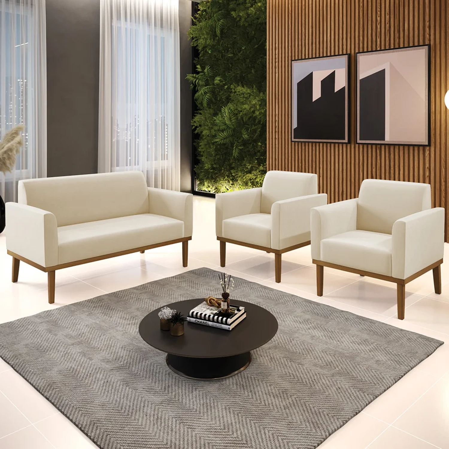 O Sofá Namoradeira e 2 Poltronas Base Madeira Castanho Maressa Suede Bege, da Ibiza é o conjunto ideal para quem busca beleza, conforto e versatilidade. Você pode usar na sua Sala De Estar, recepção ou qualquer outro ambiente que desejar.