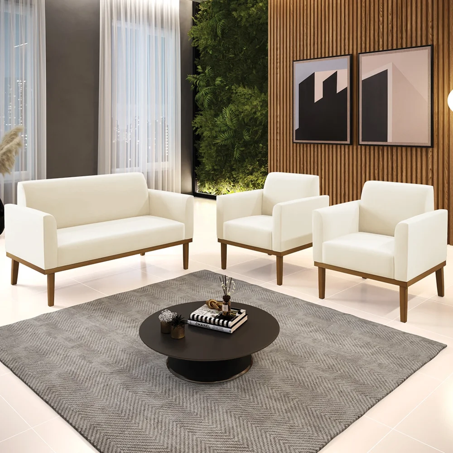 O Sofá Namoradeira e 2 Poltronas Base Madeira Castanho Maressa Veludo Bege, da Ibiza é o conjunto ideal para quem busca beleza, conforto e versatilidade. Você pode usar na sua Sala De Estar, recepção ou qualquer outro ambiente que desejar.