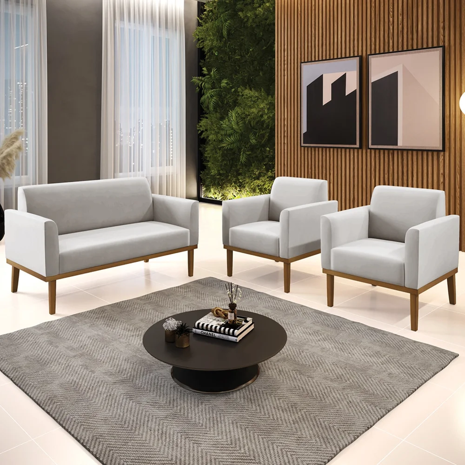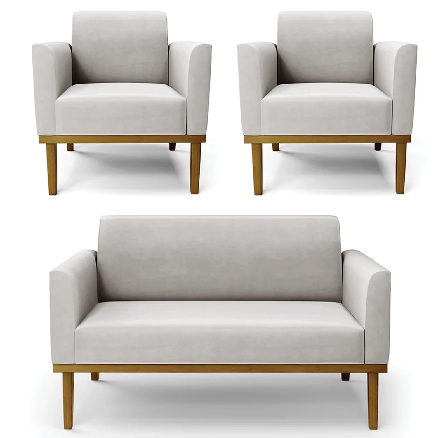 O Sofá Namoradeira e 2 Poltronas Base Madeira Castanho Maressa Veludo Cinza, da Ibiza é o conjunto ideal para quem busca beleza, conforto e versatilidade. Você pode usar na sua Sala De Estar, recepção ou qualquer outro ambiente que desejar.
