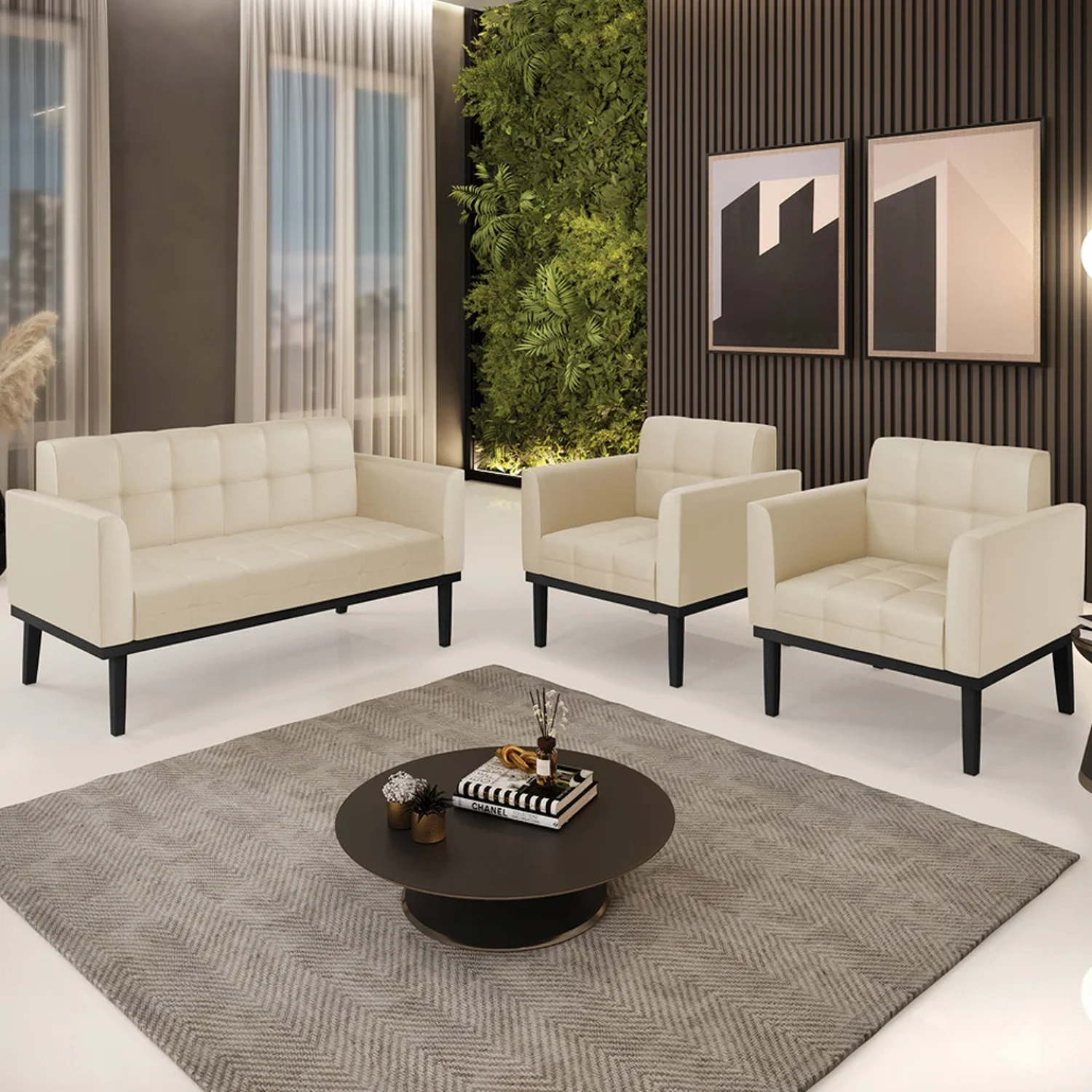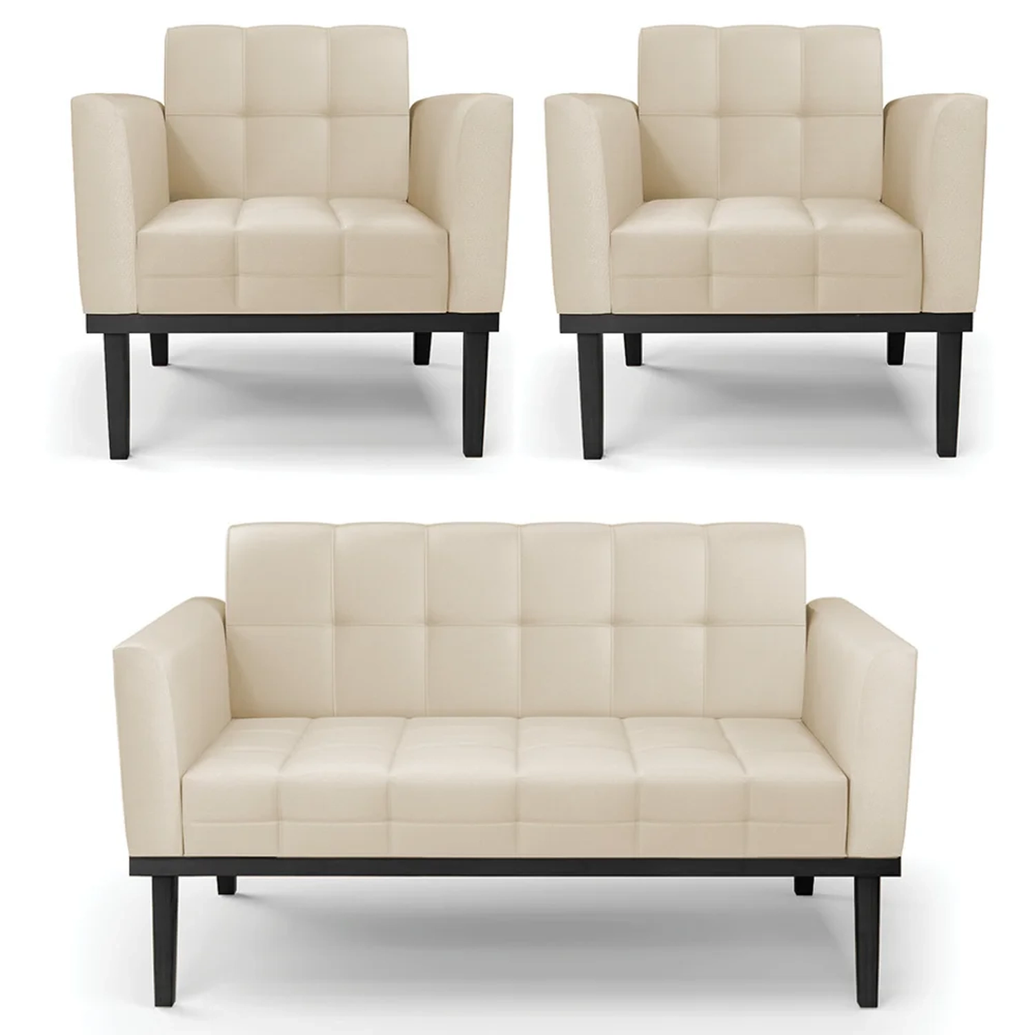 O Sofá Namoradeira e 2 Poltronas Base Madeira Preto Ana Sintético Bege, da Ibiza é o conjunto ideal para quem busca beleza, conforto e versatilidade. Você pode usar na sua Sala De Estar, recepção ou qualquer outro ambiente que desejar.