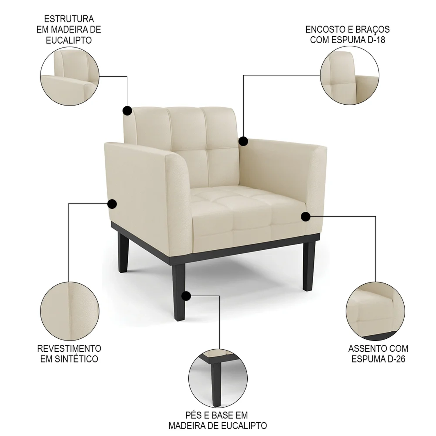 Material da Espuma: Assento D-26/ Encosto e braços D-18.