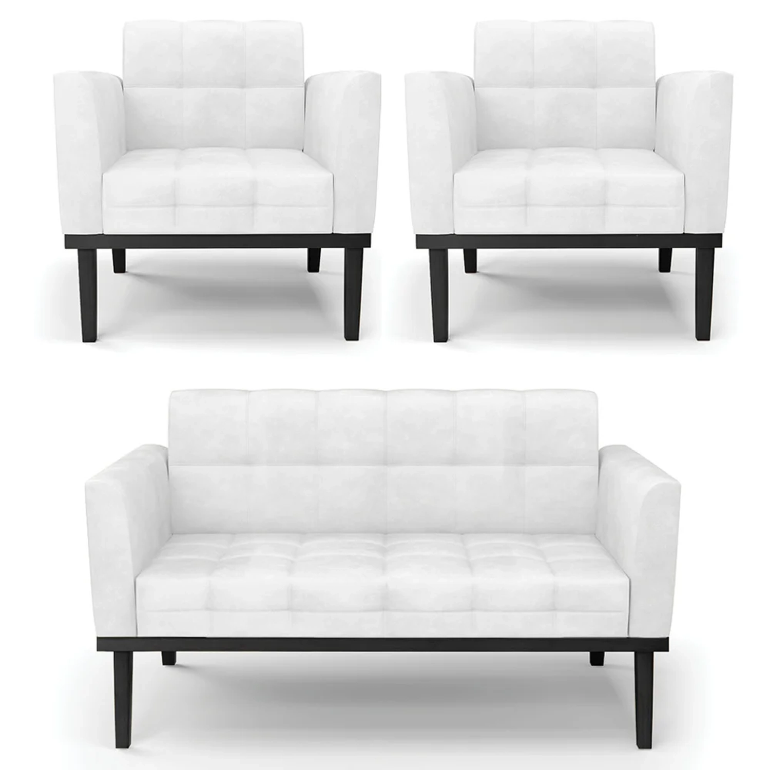 O Sofá Namoradeira e 2 Poltronas Base Madeira Preto Ana Sintético PU Branco, da Ibiza é o conjunto ideal para quem busca beleza, conforto e versatilidade. Você pode usar na sua Sala De Estar, recepção ou qualquer outro ambiente que desejar.