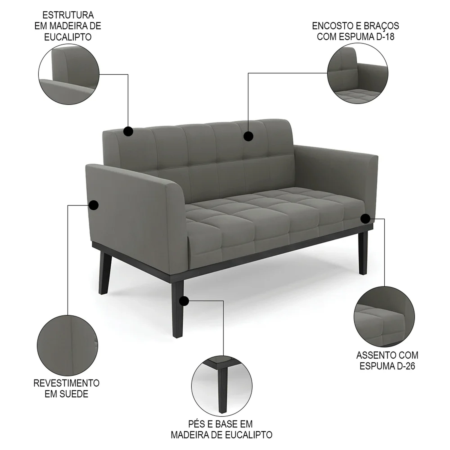 O Sofá Namoradeira e a Poltrona Decorativa são revestidos em Suede, que é fácil de limpar e valoriza o design das peças. Eles têm braços e encosto em espuma D-18 e assento em espuma D-26, que oferecem firmeza e aconchego para você relaxar. A base em madeira de eucalipto Preto é um detalhe charmoso, que dá um toque rústico e sofisticado ao conjunto. O kit tem uma estrutura resistente e suporta até 120 kg cada peça. A montagem é simples, pois as peças já vêm prontas, bastando fixar a base com os parafusos que acompanham o produto. A limpeza é prática, pois basta usar um pano limpo e levemente úmido, sem produtos abrasivos, para manter o seu kit sempre em bom estado. Hora de transformar seu ambiente com a Namoradeira 2 Lugares e a Poltrona para Sala deixando ainda mais confortável e estiloso.