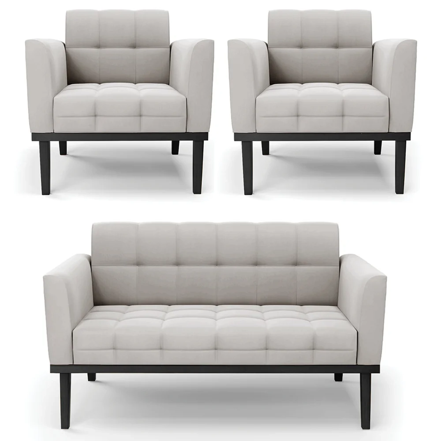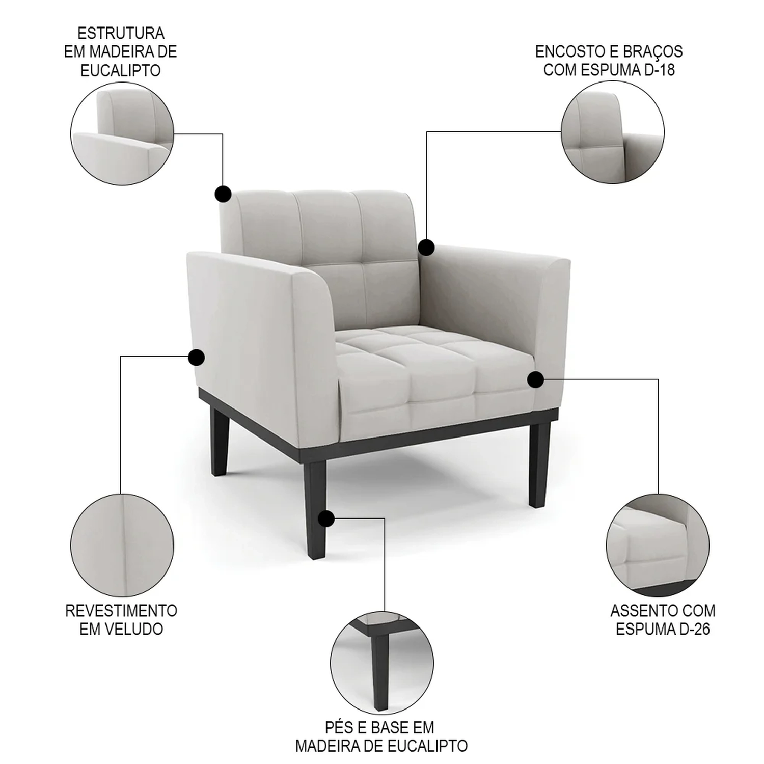 O Sofá Namoradeira e 2 Poltronas Base Madeira Preto Ana Veludo Cinza, da Ibiza é o conjunto ideal para quem busca beleza, conforto e versatilidade. Você pode usar na sua Sala De Estar, recepção ou qualquer outro ambiente que desejar.