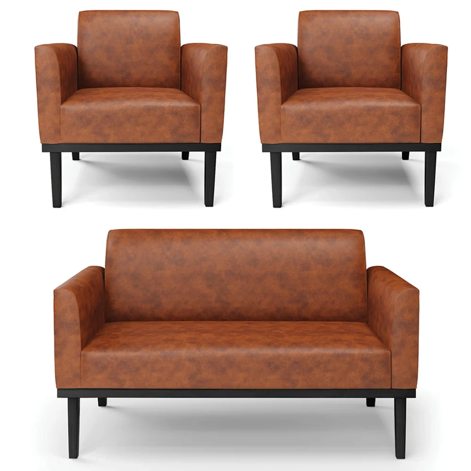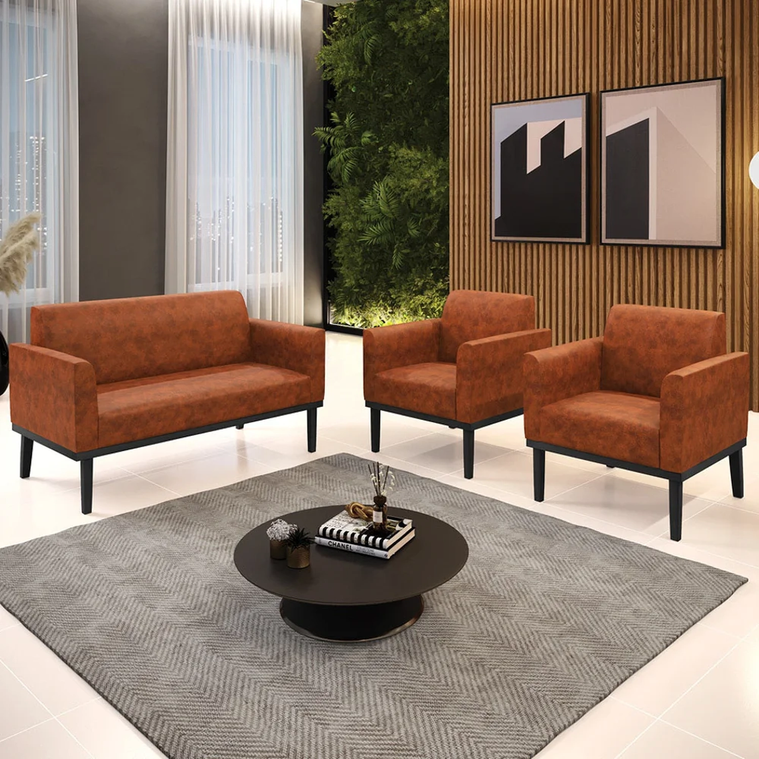 O Sofá Namoradeira e 2 Poltronas Base Madeira Preto Maressa Sintético PU Nozes, da Ibiza é o conjunto ideal para quem busca beleza, conforto e versatilidade. Você pode usar na sua Sala De Estar, recepção ou qualquer outro ambiente que desejar.