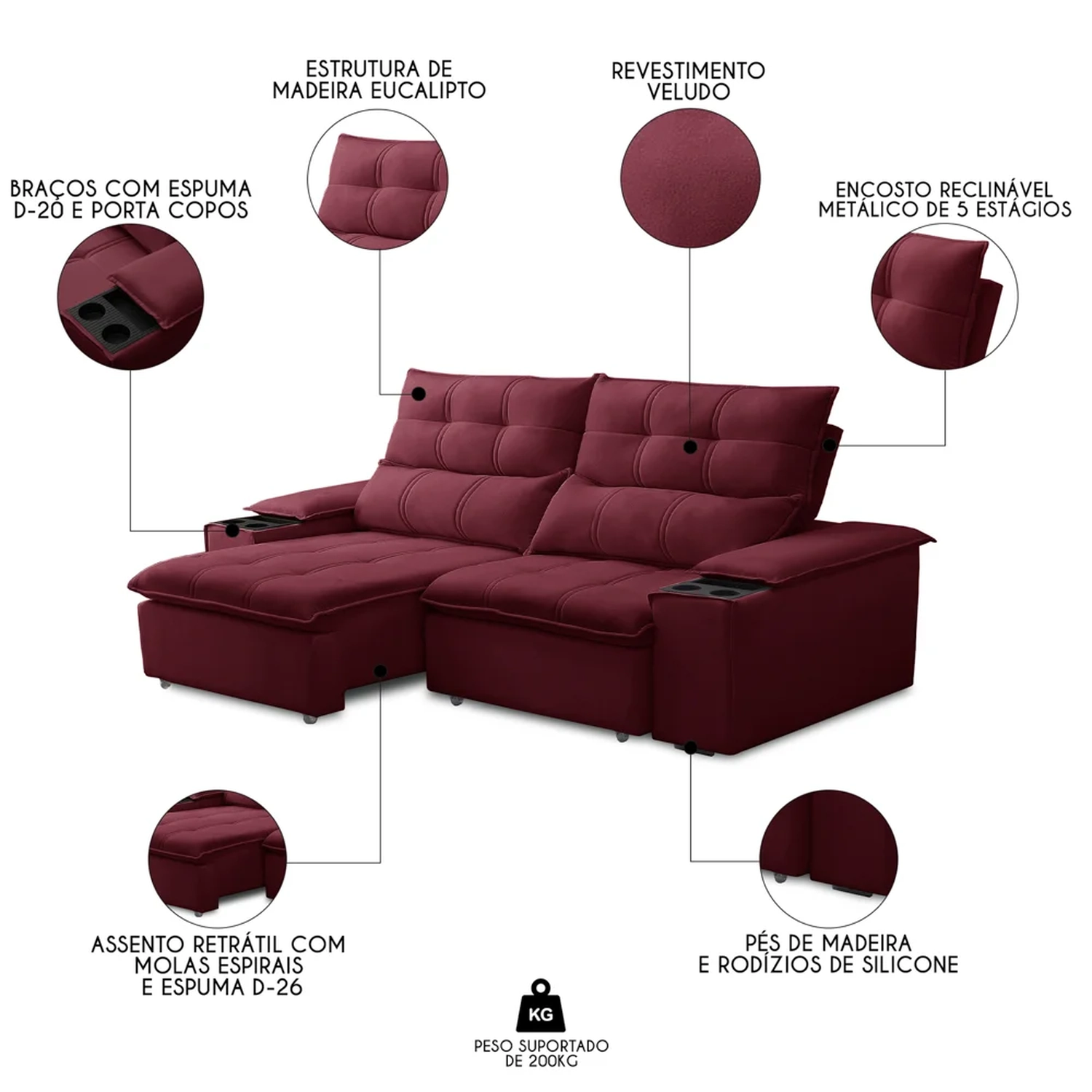 Um móvel que combina conforto, beleza e praticidade! Conheça o Sofá Retrátil 3 Lugares com Porta Copo 210cm Malta F05 Veludo Bordô, da Mpozenato.