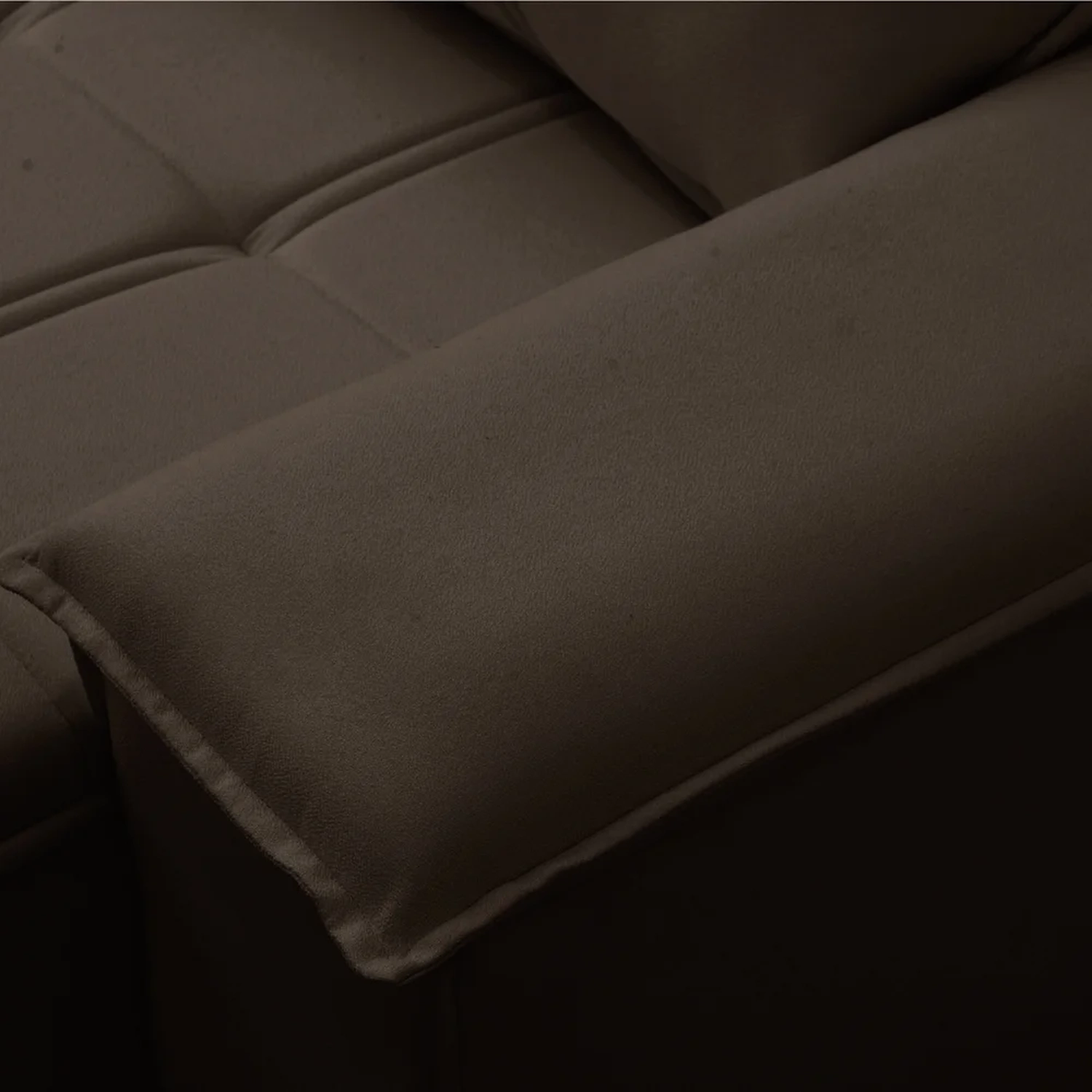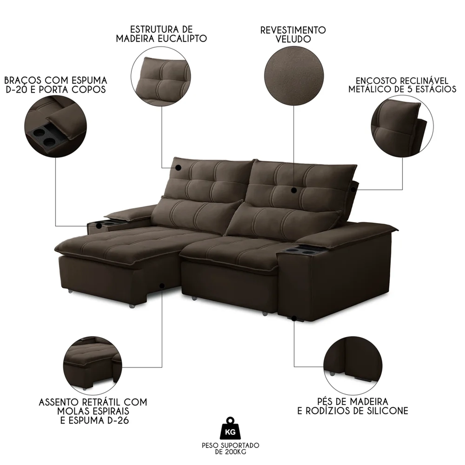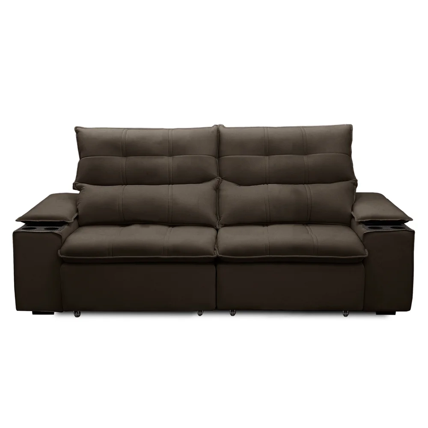 Um móvel que combina conforto, beleza e praticidade! Conheça o Sofá Retrátil 3 Lugares com Porta Copo 210cm Malta F05 Veludo Marrom Escuro, da Mpozenato.