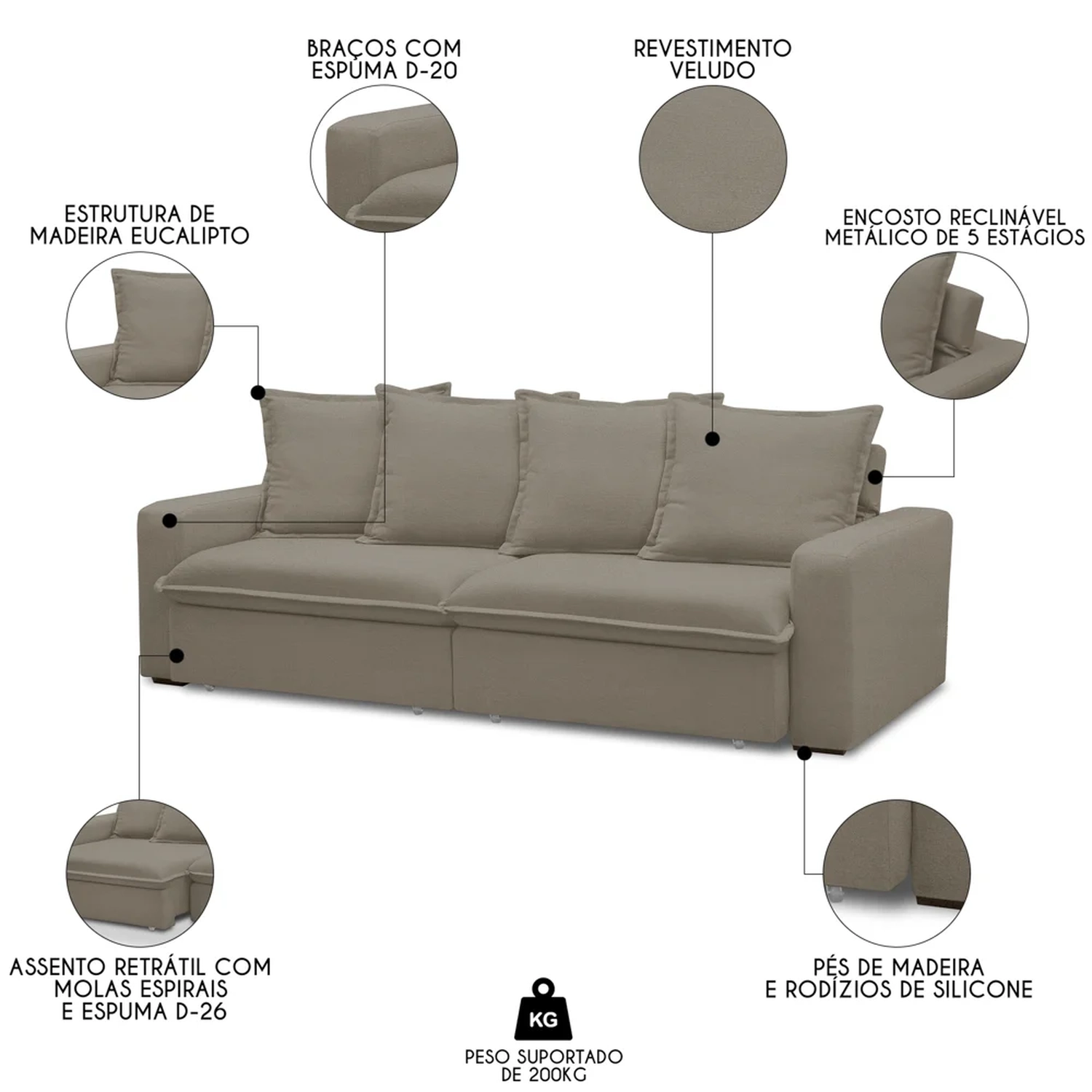 Hora de transformar a sua sala de estar em um ambiente mais aconchegante e sofisticado com o Sofá Retrátil Reclinável 3 Lugares 215cm Roma F05 Veludo Marrom, da Mpozenato!