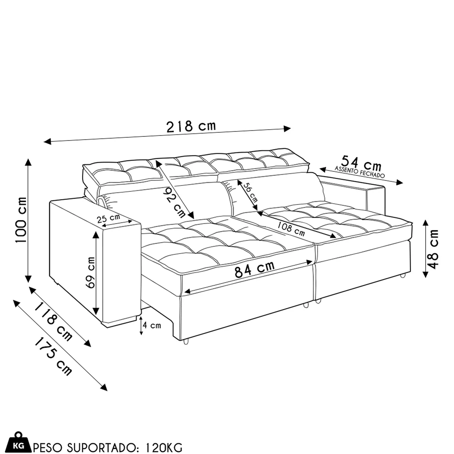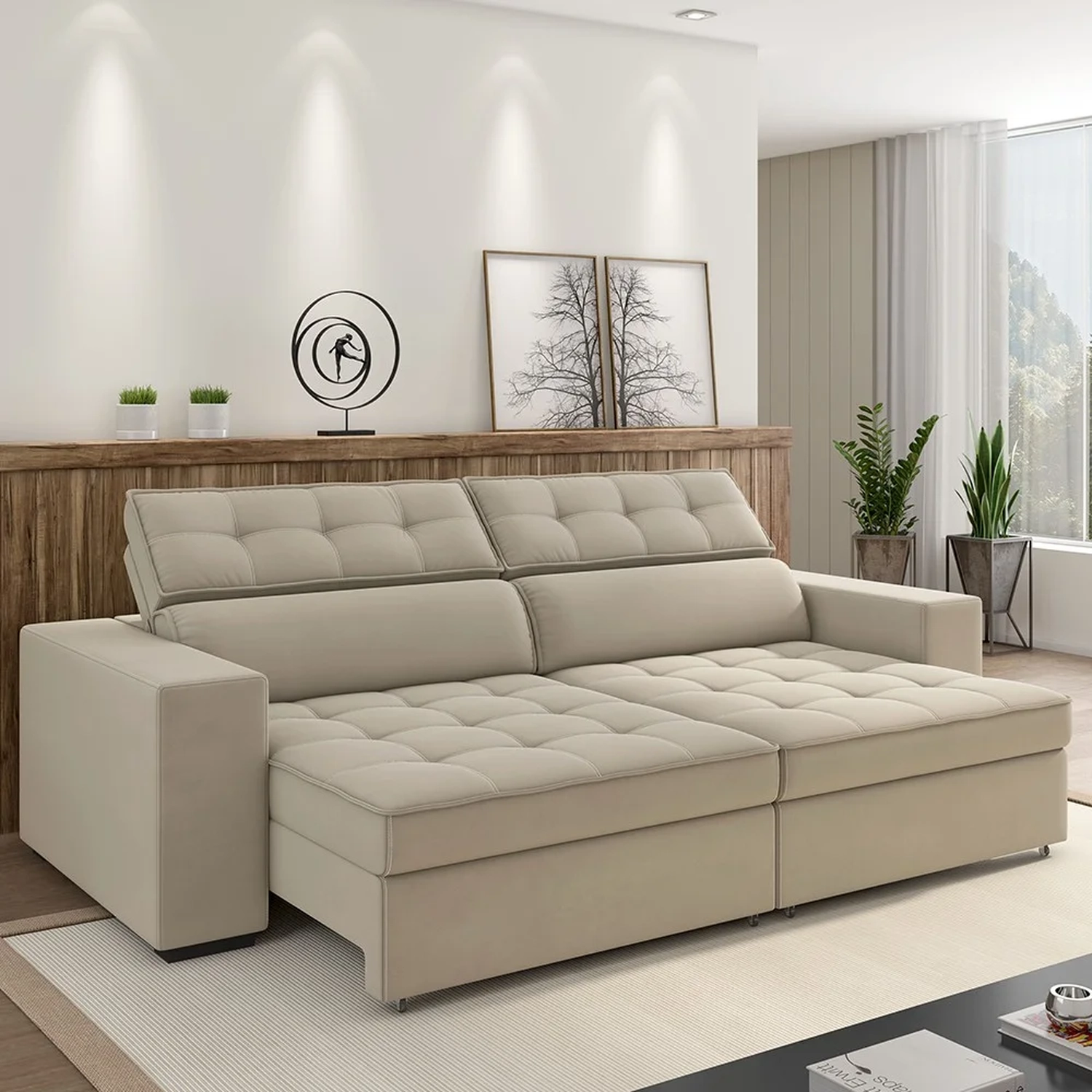 Projetado com design moderno, esse sofá retrátil é sinônimo de qualidade, já que seu conforto fica por conta da espuma de alta densidade aliada às molas espirais e molas ensacadas que garantem o duplo molejo e muito mais aconchego; enquanto que o revestimento em suede oferece um toque macio e suave. Além disso, a funcionalidade também faz parte desse estofado, uma vez que esse sofá 3 lugares pode ser aproveitado tanto aberto, quanto fechado, de acordo com a sua necessidade diária, seja para acomodar familiares e amigos para aquela conversa gostosa em um final de tarde ou para aquela sessão de filmes no fim de semana.