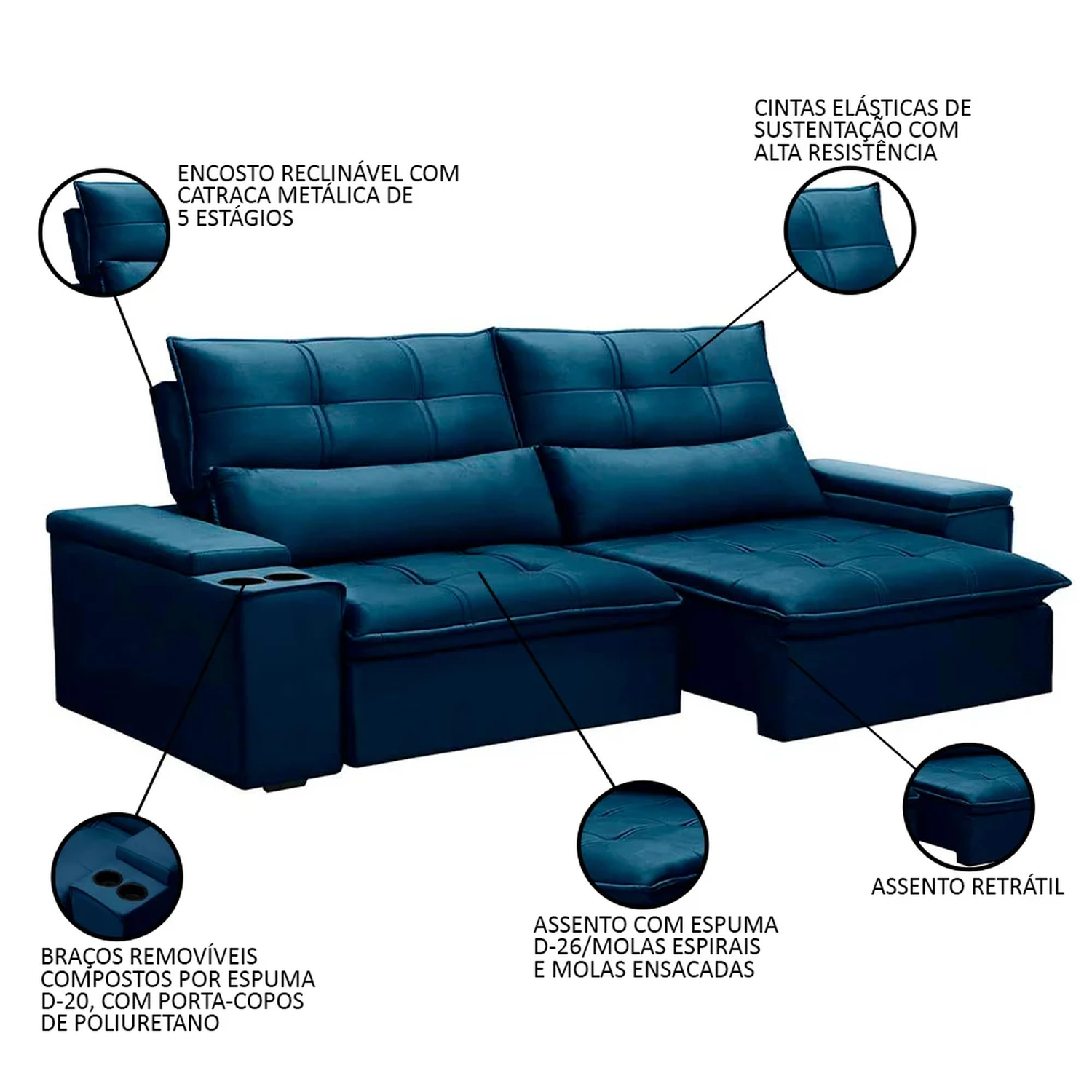 Material do Assento: Espuma D-26/Molas Ensacadas/Molas Espirais.