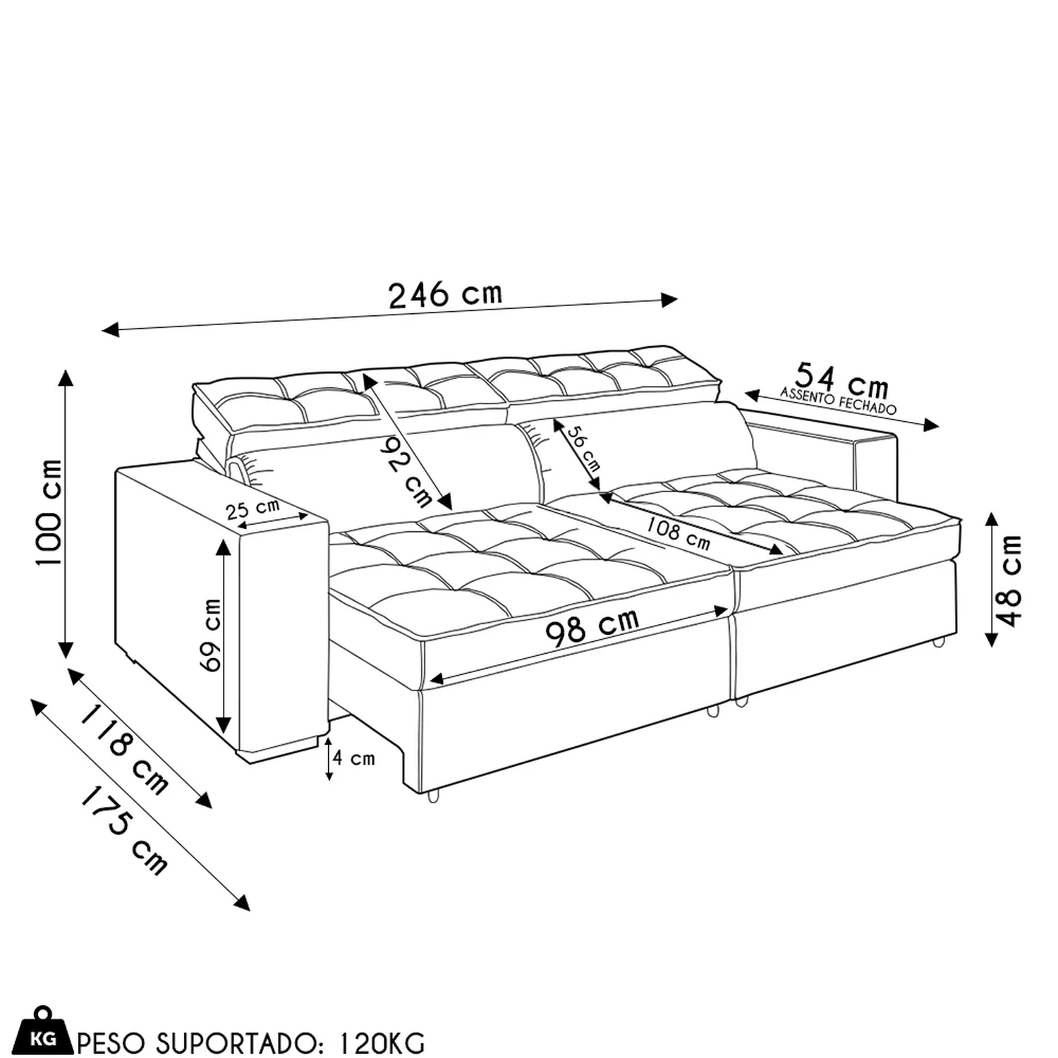 Peso Suportado: 120 kg por assento.