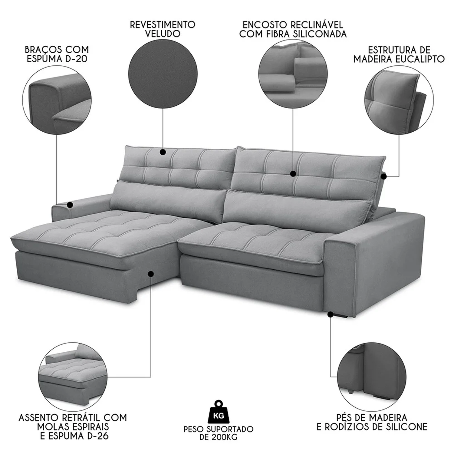 Material da Espuma: Assento espuma D-26 / Encosto fibra siliconada / Braços D-20.