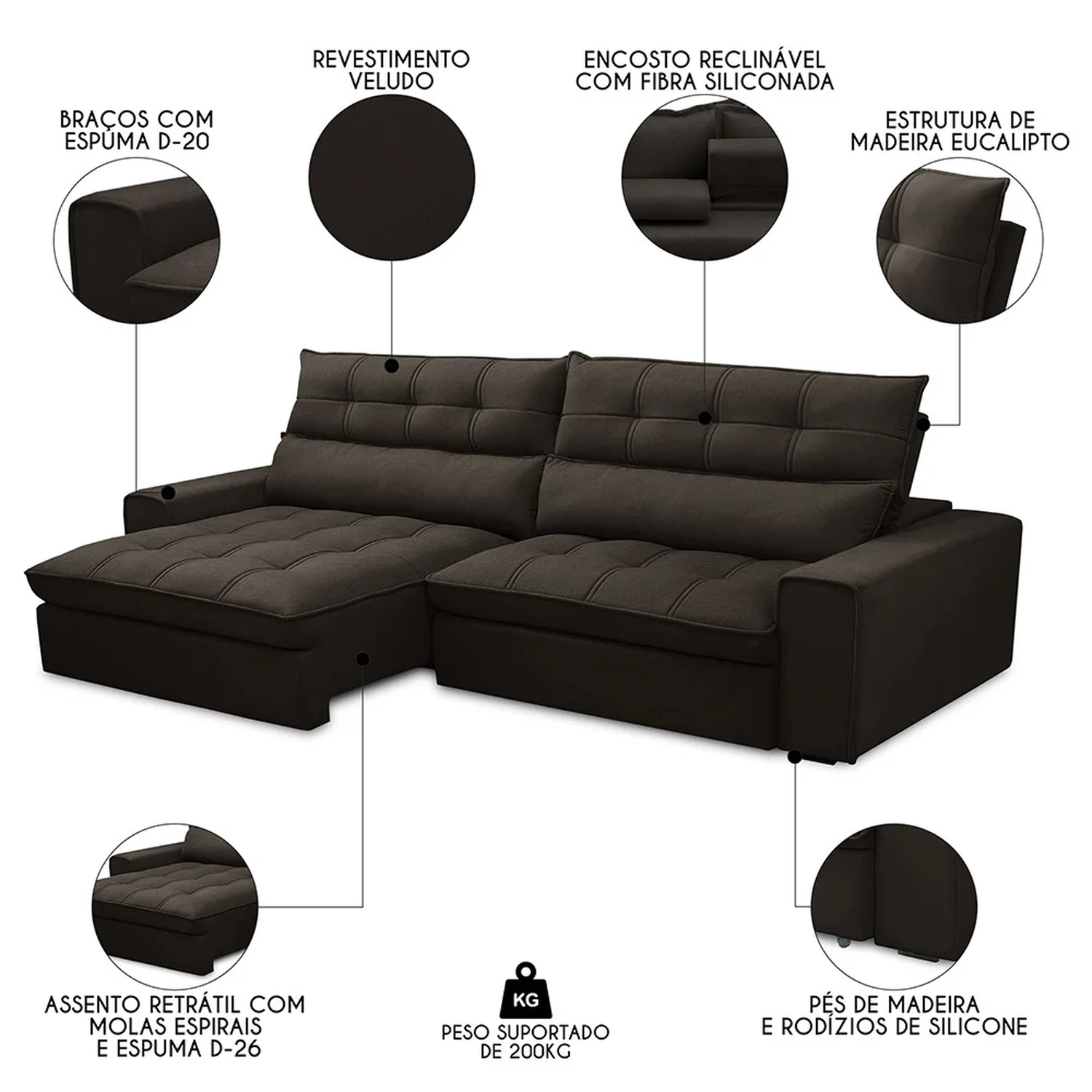 O Sofá Retrátil Reclinável 4 Lugares 290cm Damy F05 Veludo Marrom Escuro, da Mpozenato é uma ótima escolha para quem busca conforto e beleza na hora de decorar a Sala De Estar.