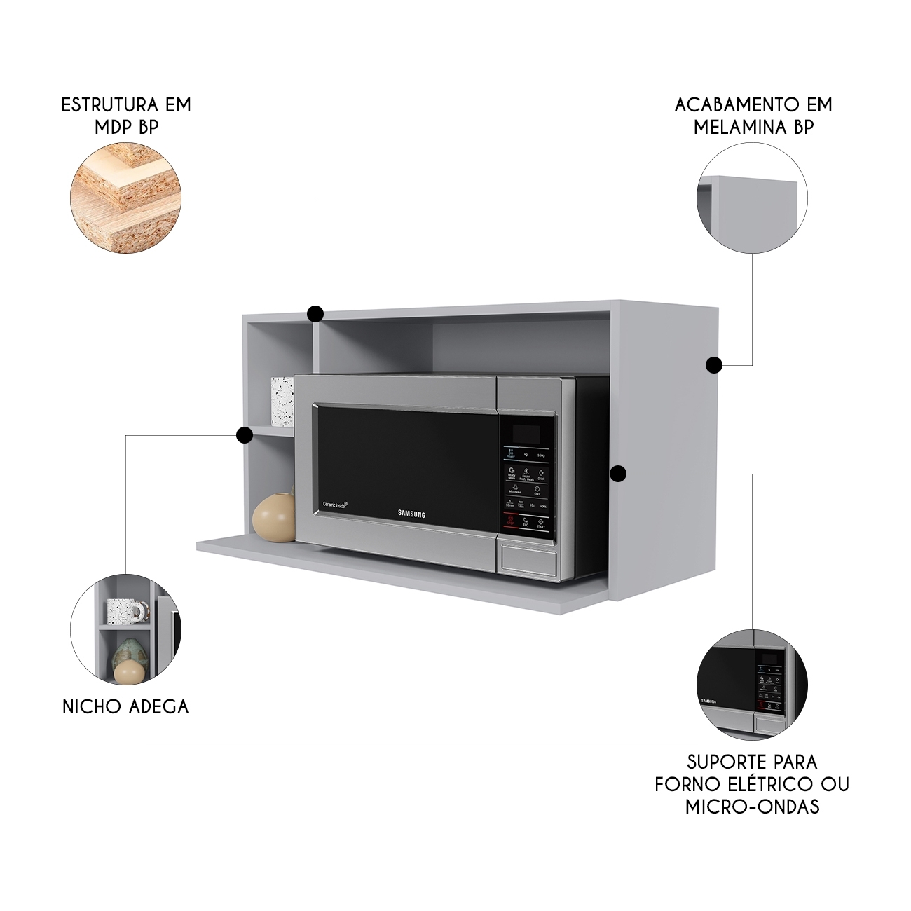 Suporte Microondas Aéreo 81cm com Nicho Adega Miami Cinza Claro - Lumil