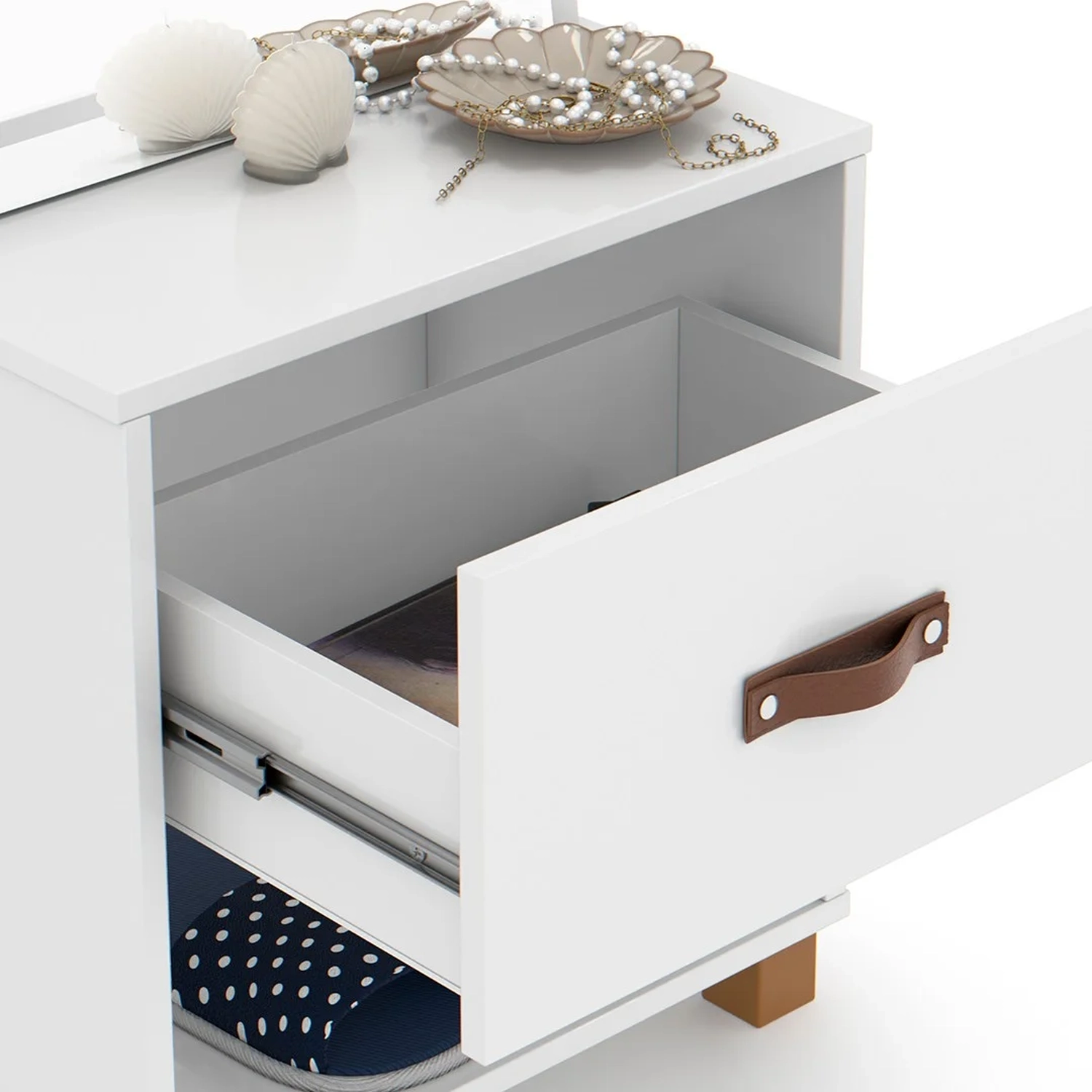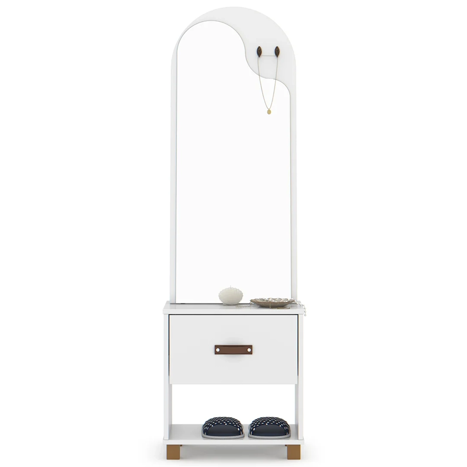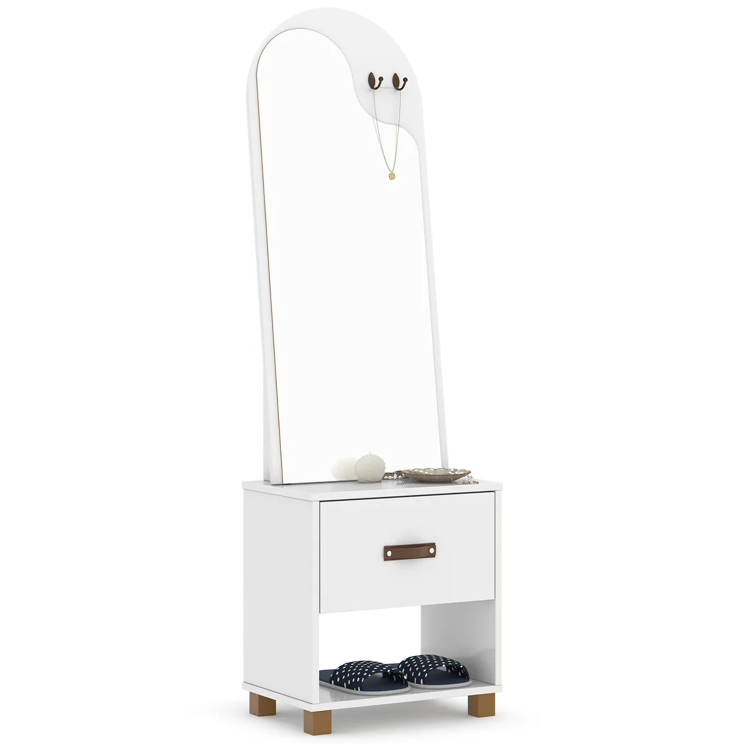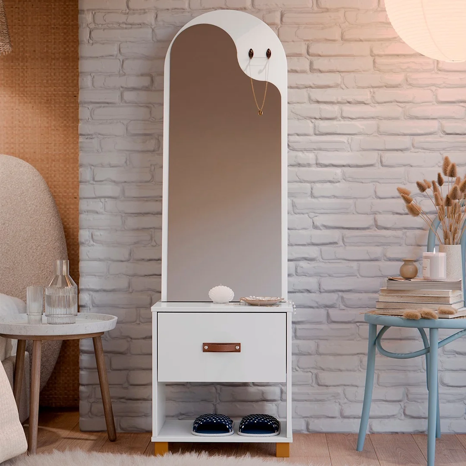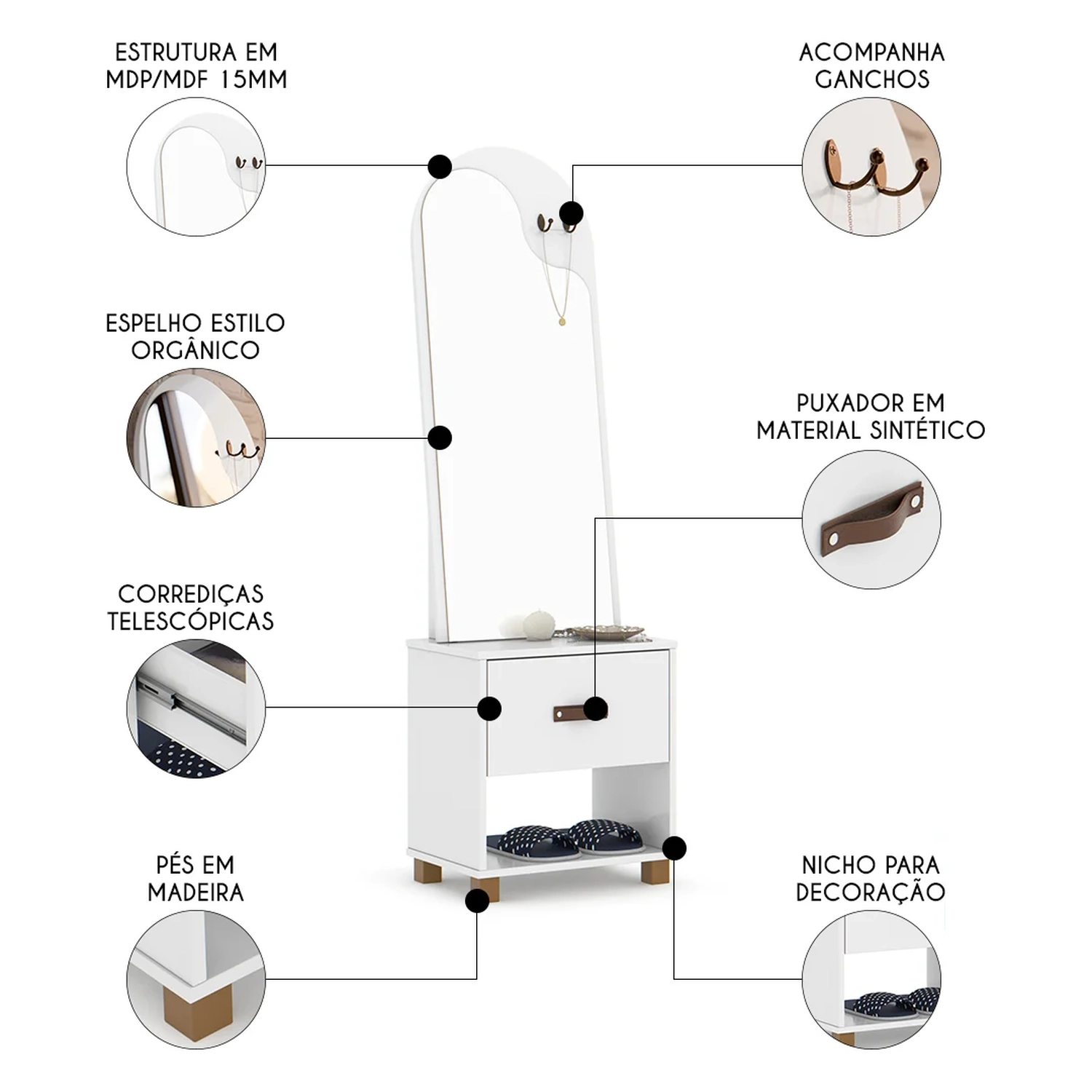 Com um design moderno e clean, o toucador Organic se adapta facilmente a qualquer ambiente, seja ele uma suíte, closet ou até mesmo um quarto pequeno. Suas linhas suaves e acabamento impecável conferem um toque de sofisticação ao ambiente, deixando-o ainda mais elegante. O destaque desse móvel estilo penteadeira é o seu amplo espelho, que proporciona uma visão completa do seu rosto e cabelo, permitindo que você faça sua maquiagem ou arrume o cabelo com precisão. Já com a gaveta, você terá espaço suficiente para guardar seus produtos de beleza, como maquiagens, cremes, perfumes e acessórios. Tudo ficará organizado e ao alcance das suas mãos, facilitando a rotina de beleza do seu dia a dia.
