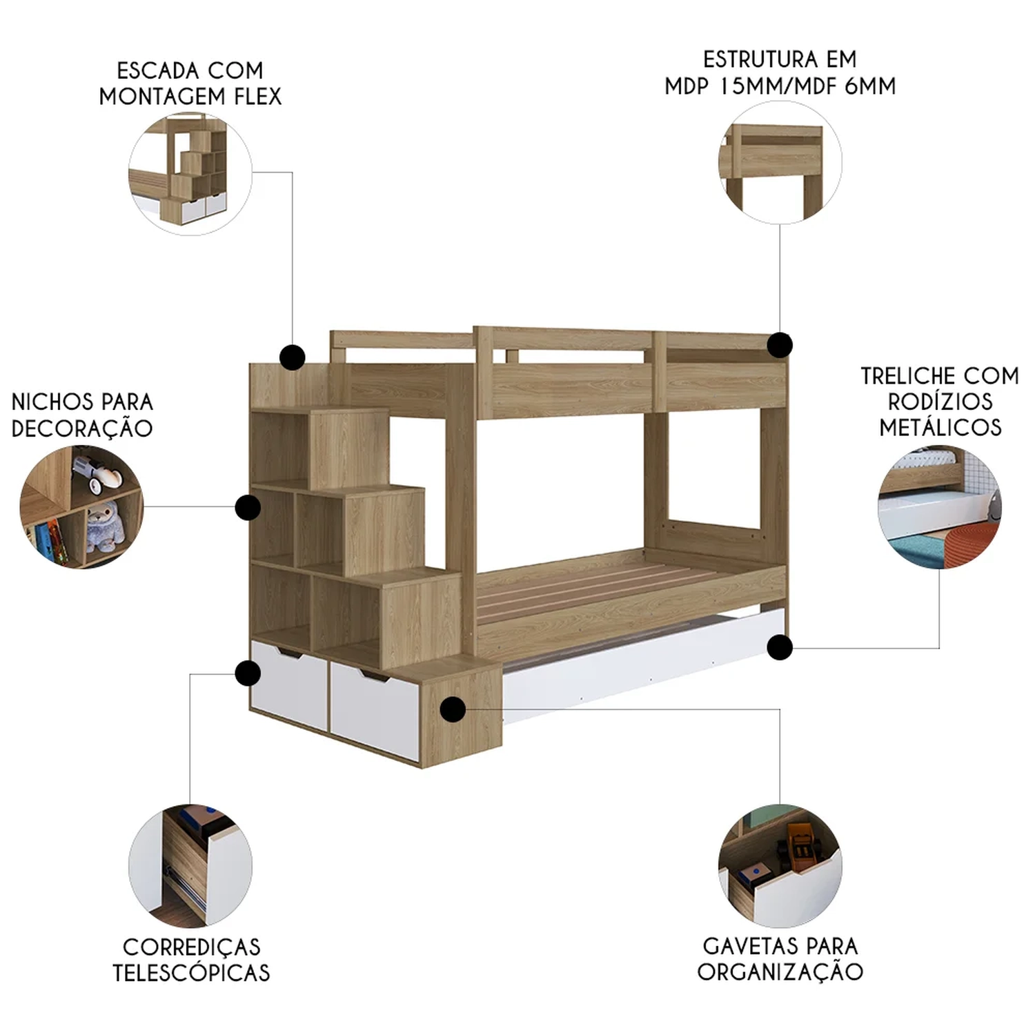 A Treliche Infantil Com Escada e Nichos Infix C06 Aveiro/Branco, da Mpozenato, é uma solução inovadora e inteligente para transformar o Ambiente Infantil em um espaço encantador e funcional.